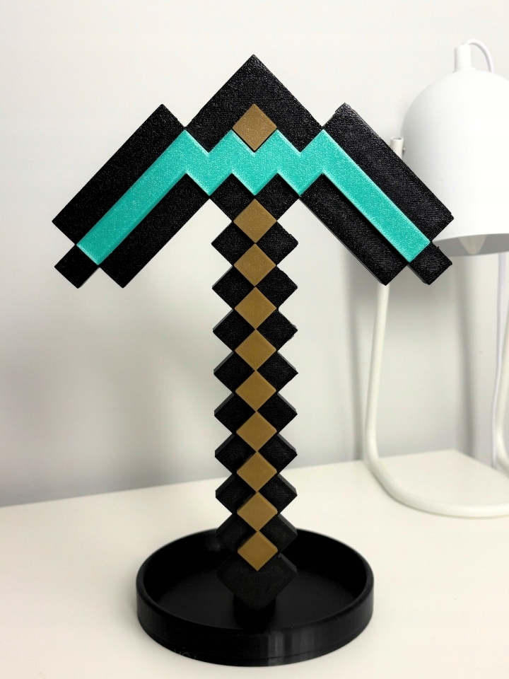 Черный столбик и гладкое основание создают современную форму, которая отлично смотрится рядом с компьютером или консолью. Мотив кирки добавляет характер и напоминает, что каждое приключение начинается с первого удара по колоде. ⛏️