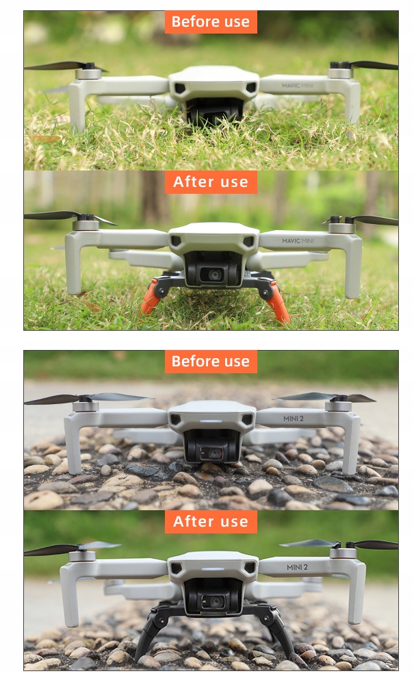 Ножки касаются посадочной поверхности по всей длине, поэтому мы можем уверен, что дрон приземлится ровно и устойчиво, а видео, записанное во время приземления, будет более плавным.