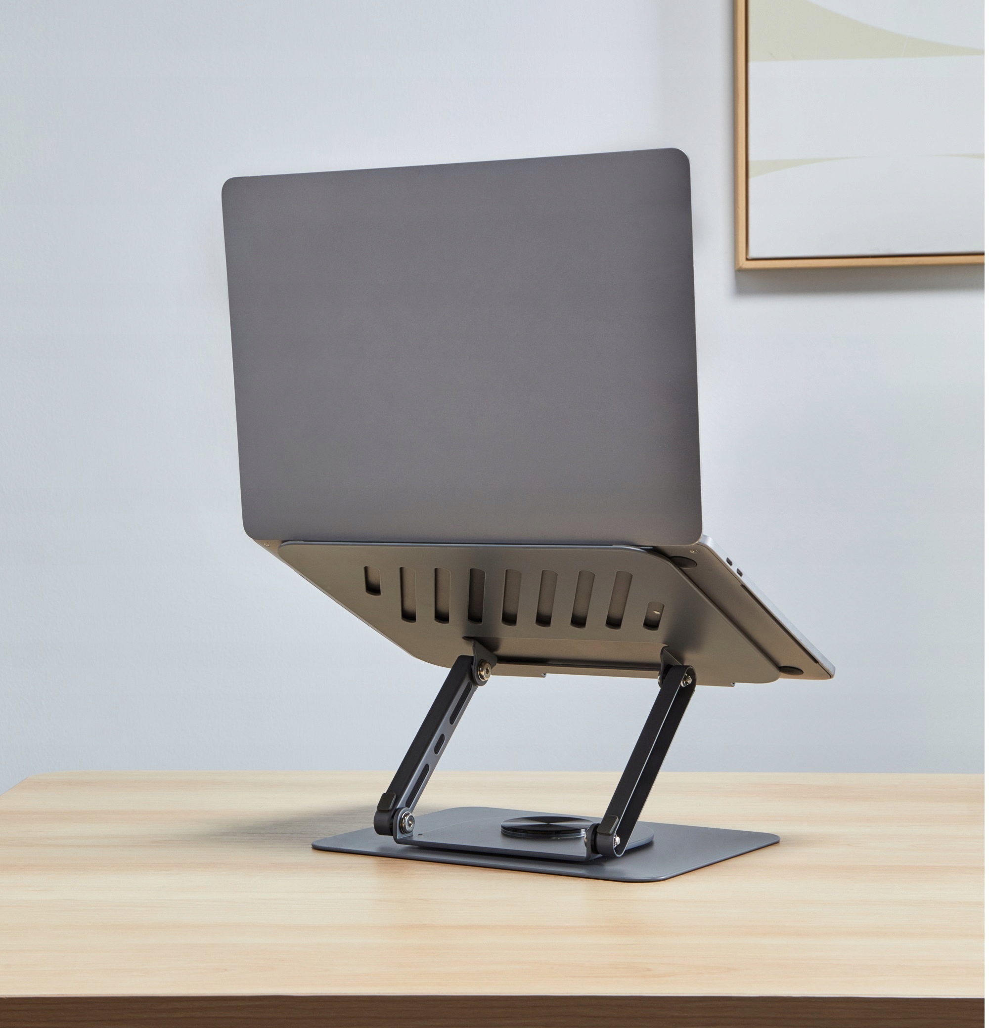 Благодаря функции вращения 360 °, эта подставка для ноутбука предлагает необычайную универсальность. Вы можете легко повернуть экран в любом направлении, который является идеальным решением во время встреч, презентаций или групповой работы. Поворот позволяет быстро делиться контентом без необходимости перемещать все устройство. Это также отличная помощь для людей, которые часто переключаются между различными задачами или нуждаются в удобном угле просмотра из разных мест за столом. Функция вращения делает ваш ноутбук более функциональным и соответствует динамическому стилю работы