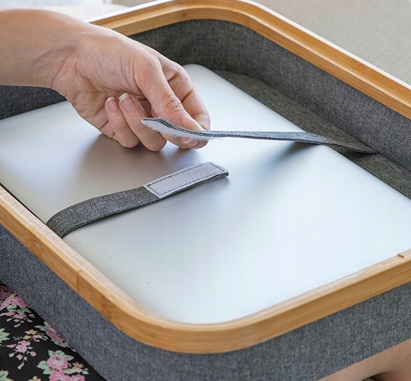 Оригинальный портативный столик для ноутбука с прочным деревянным подносом и устойчивым основанием в стильной льняной отделке. Верхний лоток выдвижной и имеет углубление, позволяющее его открывать. Под лотком есть отсек для хранения множества вещей (ноутбук, мышь, мобильный телефон, зарядное устройство, ручка, блокнот, очки, наушники и т. д.). Благодаря тому, что отделение оснащено ремешками с липучками, вы можете легко хранить там свой ноутбук. Этот многофункциональный и универсальный стол можно адаптировать к различным местам и условиям работы. Кроме того, этот небольшой приставной столик легко хранить и транспортировать: Он идеально подходит для комфортной работы за ноутбуком, а также для письма, чтения, рисования, приема пищи и т. д. Его можно использовать в различных местах, например, на кровати, диване, кресле и т. д.