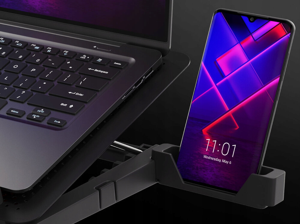 - , посвященный ноутбукам: 15,6 Алюминиевая конструкция, HUB USB, подсветка, держатель телефона