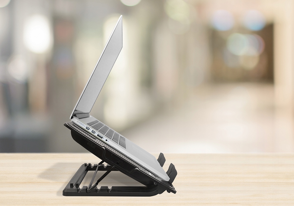 Подставка оснащена нескользящими ножками и замками, предотвращающими выскальзывание ноутбука. Благодаря четырёхступенчатой регулировке вы можете выбрать подходящую высоту для работы. Подставку также можно разместить в горизонтальном положении.