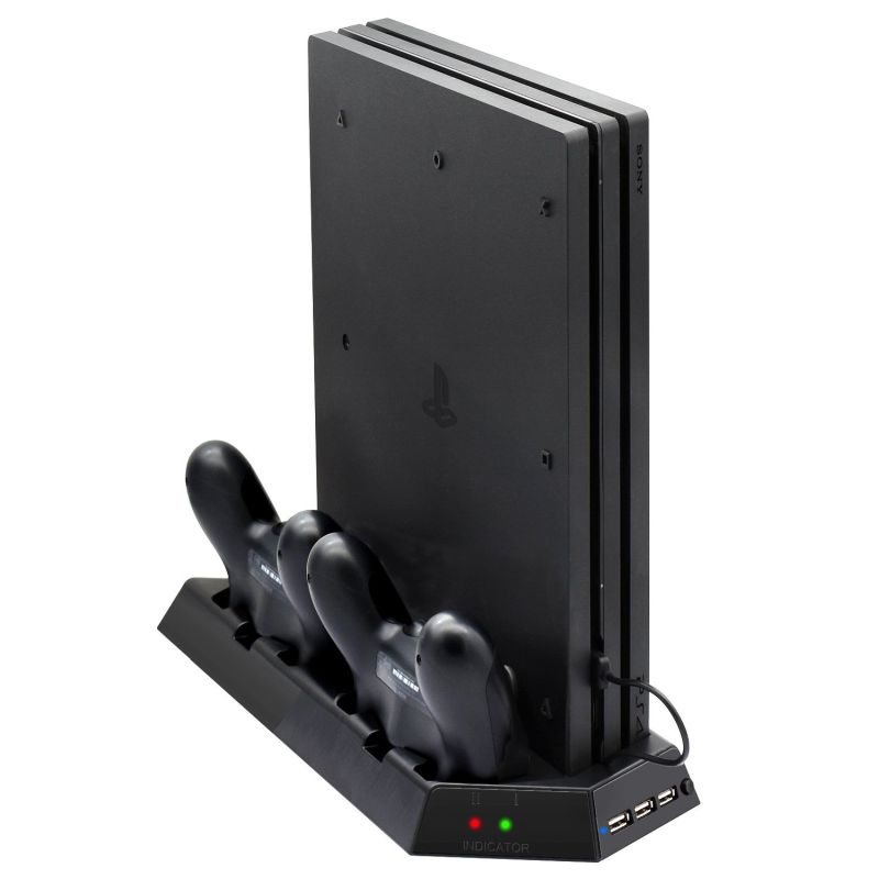 Подставка позволяет разместить консоль PlayStation 4 PRO на боковой стене. Это экономит место. Подставка изготовлена из прочного пластика, поэтому ее можно использовать годами. Подставка оснащена двумя вентиляторами для охлаждения консоли. Под подставкой есть резинки для стабилизации консоли. Станция включает в себя 2 док-станции для их зарядки. Кроме того, он оснащен 3 портами USB. Товар совершенно новый.