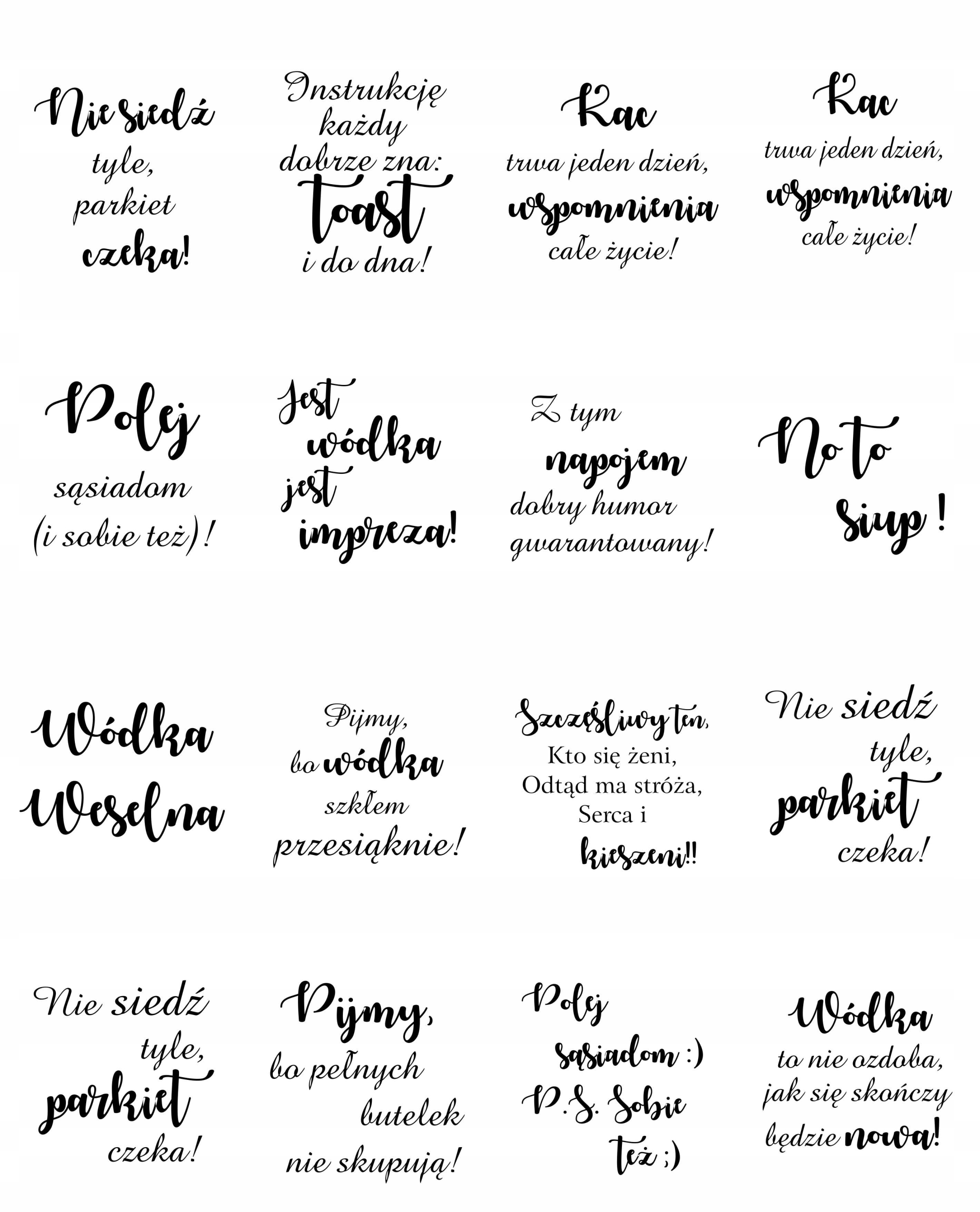 За 30 злотых вы получите 1 комплект, т.е. 50 штук алкогольных подвесок с различными текстами, микс из 16 текстовых узоров + золотые нити. p>