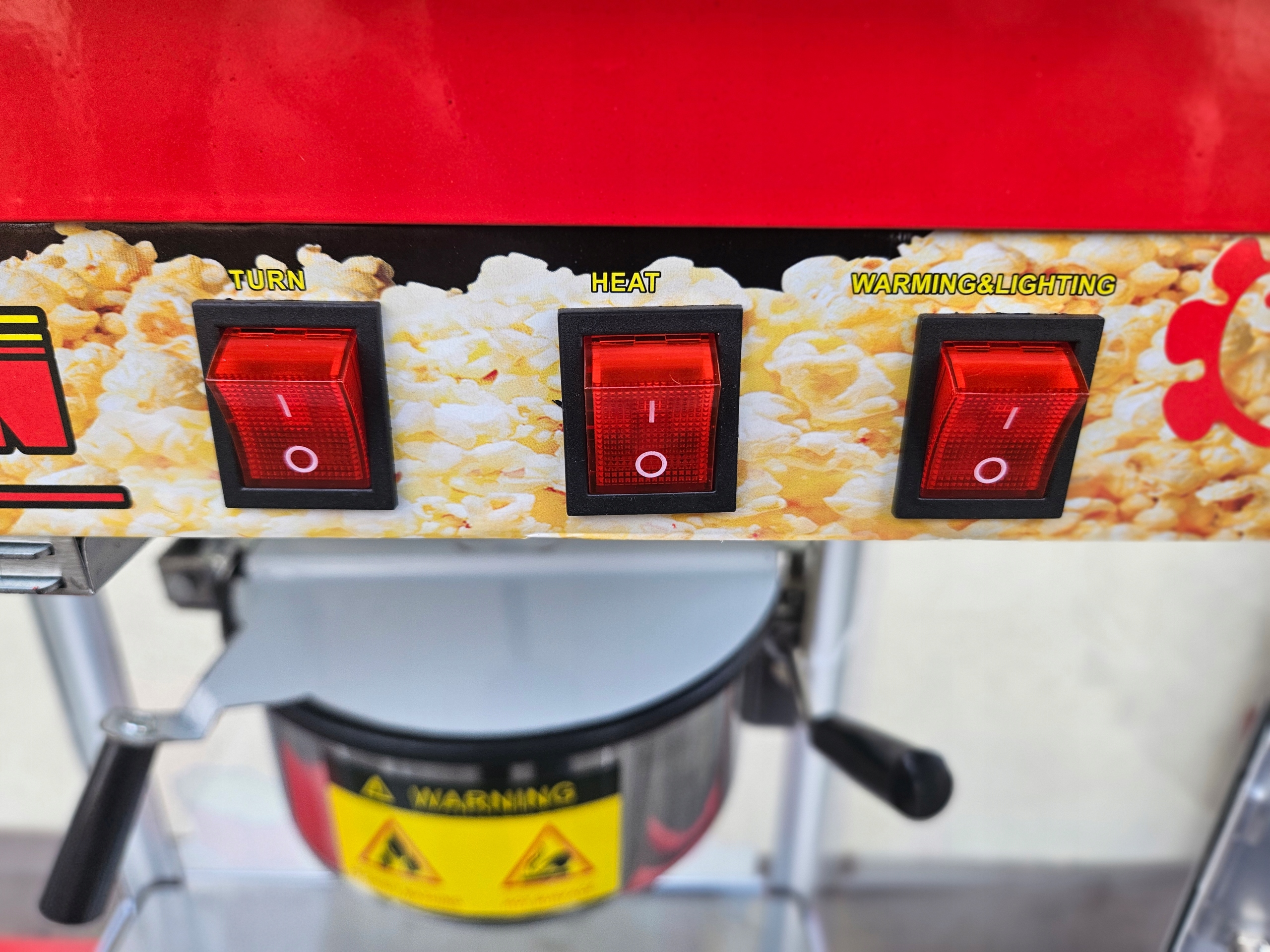 Запуск устройства Popcorn чрезвычайно проста. Просто подключите шнур питания с длиной ~ 2 м к розетку. Над двери есть три переключателя. Тепловой кнопку активирует нагревательный элемент. Чтобы не сжигать зерна в нижней части кастрюли во время производства, включите систему смешивания с помощью кнопки поворота. Кроме того, тефлоновое покрытие на горшке предотвратит прилипание попкорна. Переключатель мощности и света вы включаете вентиляцию и нагрев камеры