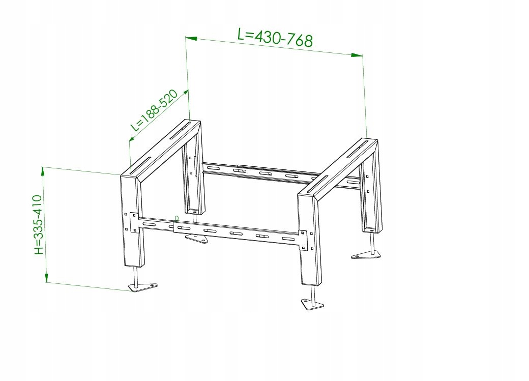 Опора рамы теплового насоса и кондиционера изготовлена из листового металла толщиной 2 мм, оцинкована и покрыта порошковой краской, что обеспечивает устойчивость к коррозии на долгие годы. В комплект входят все необходимые элементы для сборки, изготовлены из оцинкованной стали. Регулируемые ножки из листового металла INOX толщиной 3 мм, к которым приварен штифт из нержавеющей стали M10, что обеспечивает прочную конструкцию и устойчивость к тяжелым нагрузкам. Высота рамы Hmax=410 Hmin=335. Расстояние между осями отверстий Lmax=768 Lmin=430. Регулировка верхней части Макс = 520 Мин = 188 . В комплект входят виброизоляторы Fi40 H 30 с резьбой М8. Матовый белый цвет.