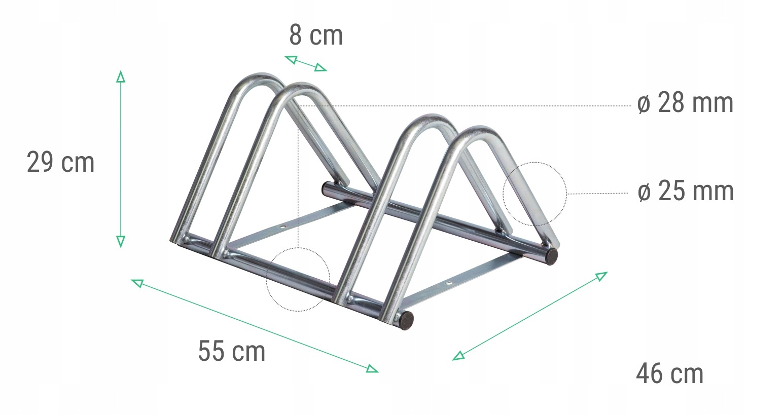 Сварная и оцинкованная подставка на 2 велосипеда, изготовлена из верхней трубы диаметром 25 мм и базовой трубы диаметром 28 мм.