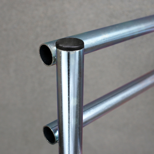 Стойка оснащена заглушками на опорных трубах.