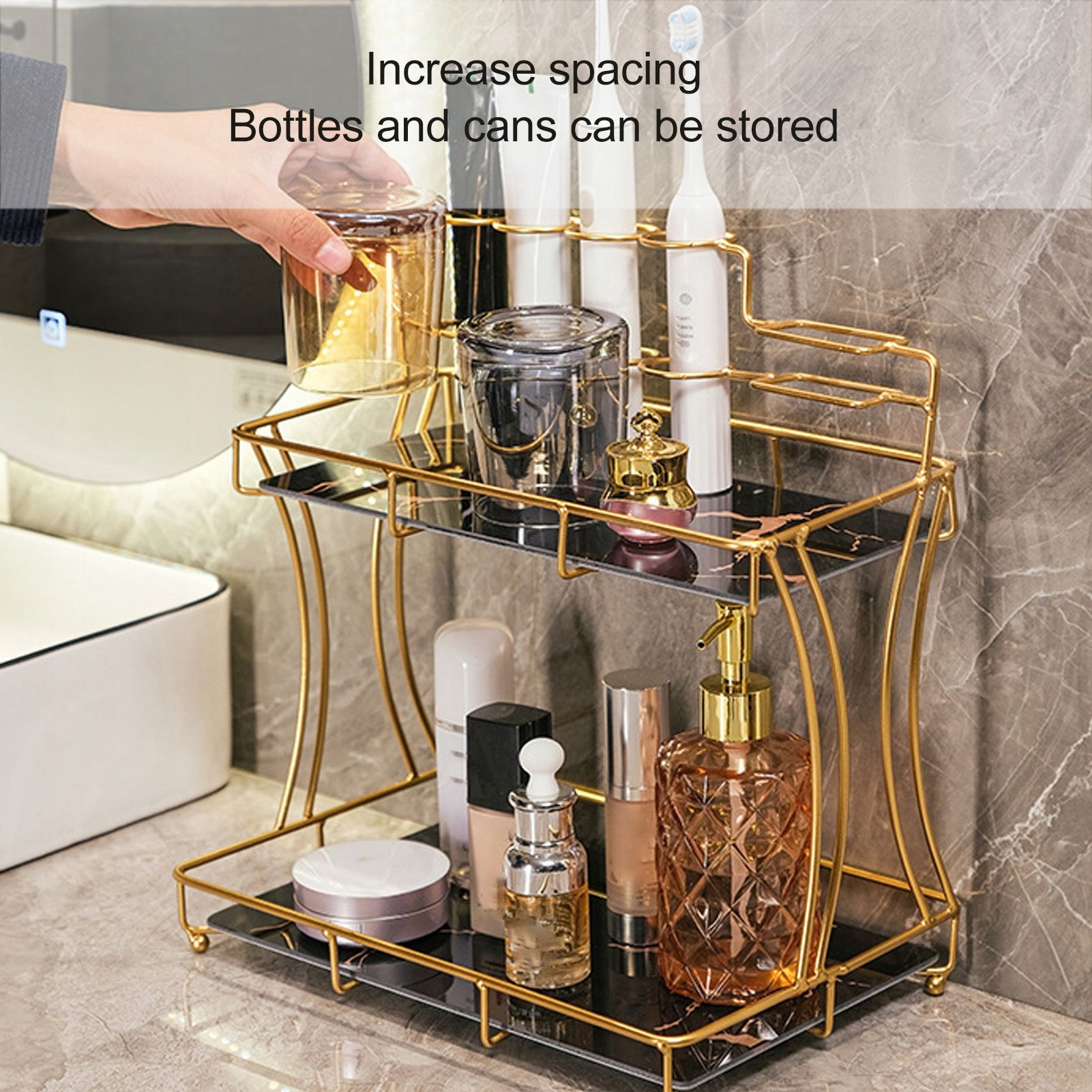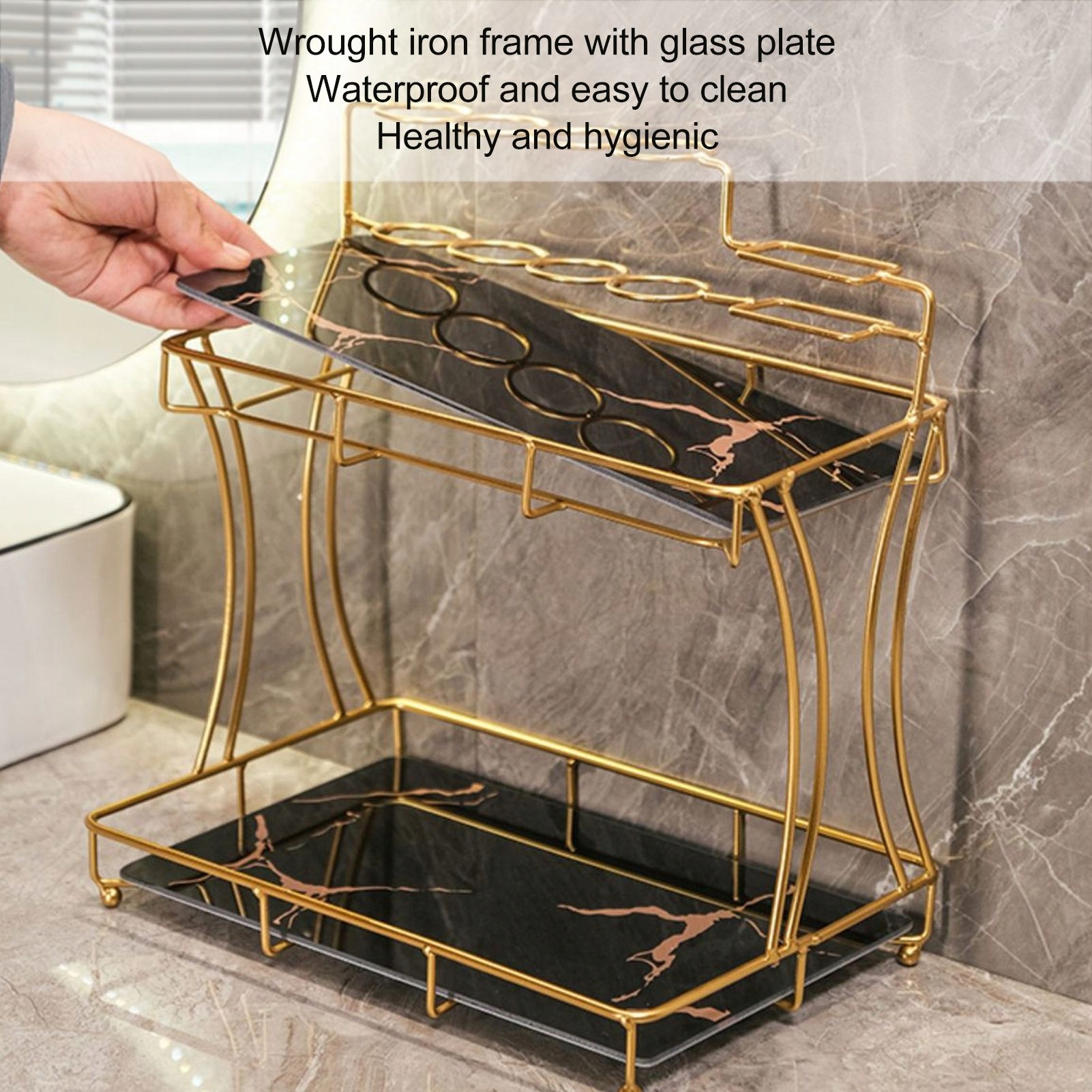 1. ДВУХСЛОЙНЫЙ: стеллаж для хранения на столешнице является двухслойным, что обеспечивает больше места для хранения и эффективно организует принадлежности для ванной и туалетные принадлежности, такие как зубные щетки.