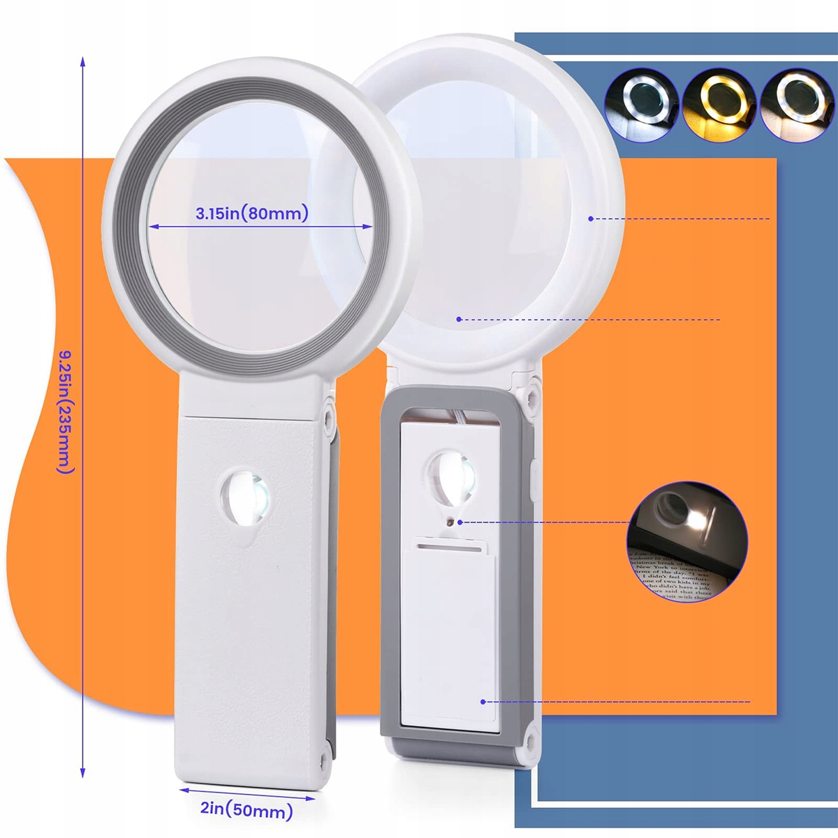 ⭐18 светодиодов и 3 режима подсветки: лупа оснащена 18 светодиодами, которые обеспечивают дополнительное освещение, облегчающее чтение. Он имеет 3 режима освещения: холодный белый, теплый белый, холодный и теплый белый.