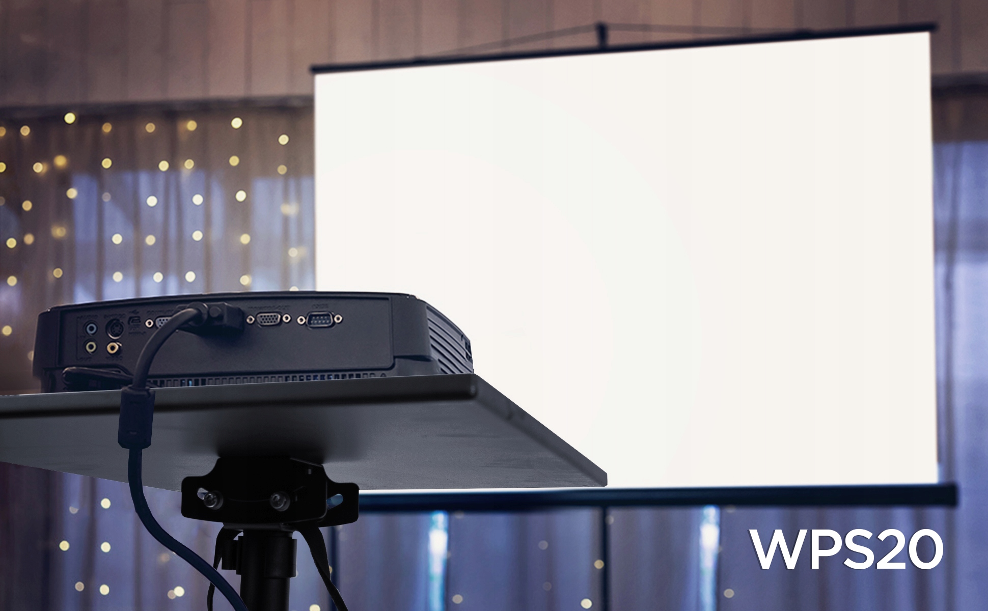 Для дополнительной безопасности WPS20 поставляется с прочным тканым ремнем, который можно закрепить вокруг проектора, чтобы он оставался на месте даже при наклоне стола.