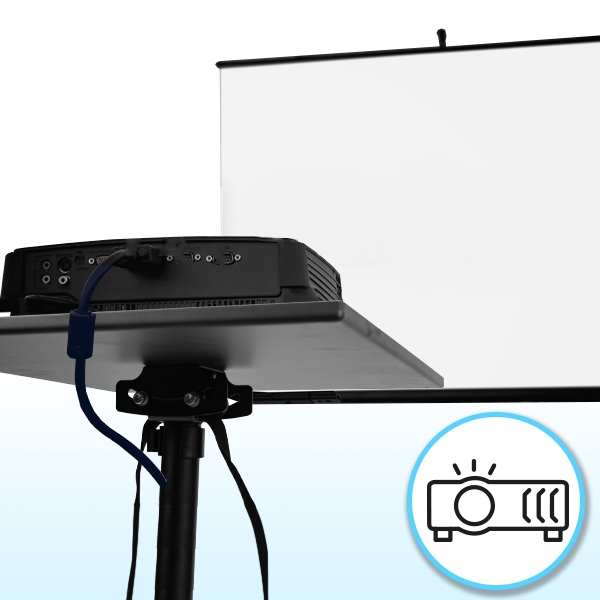 Этот портативный стол имеет уникальную функцию наклона, которая позволяет слегка регулировать угол в соответствии с проецируемым изображением, а поскольку он находится на колесиках, его также можно перемещать в любом месте относительно экрана, чтобы получить изображение наилучшего качества.