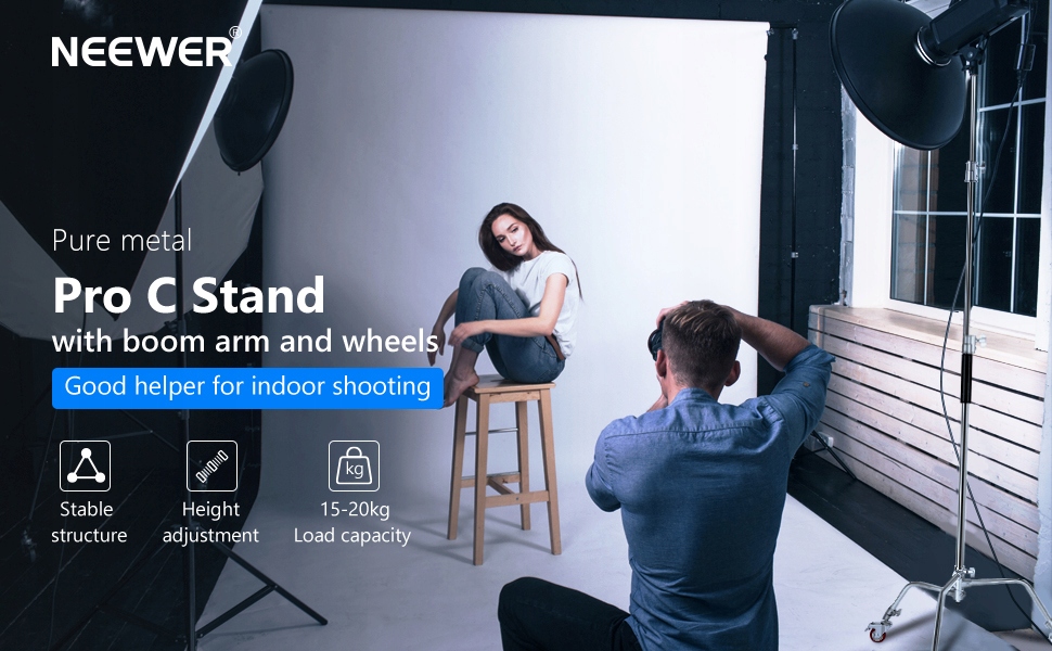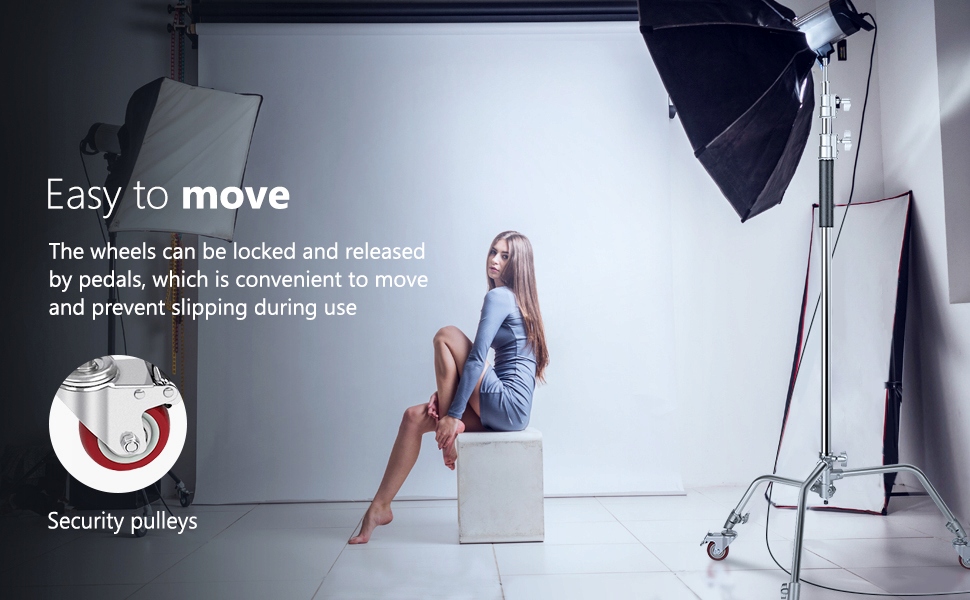 Благодаря трем поворотным колесам его очень удобно перемещать. Благодаря системе ступенчатой блокировки для блокировки и разблокировки колес ее блокировка может обеспечить вашу безопасность при использовании этого набора колес; Его резиновая основа идеально подходит для нескользящей конструкции. C-Stand изготовлен из чистого металла, что обеспечивает более длительный срок службы и исключительную долговечность в тяжелых условиях. Его высота регулируется, что позволяет удовлетворить различные потребности съемки. Прочная конструкция с тремя ножками внизу обеспечивает безопасность оборудования.