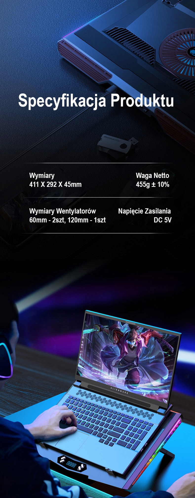 Подставка для ноутбука отличается прежде всего современным внешним видом, устойчивой конструкцией и эффективной системой вентиляторов с регулируемой скоростью. Расположение вентиляторов обеспечивает идеальное и эффективное охлаждение ноутбука независимо от расположения нагревающихся компонентов ноутбука (процессор, видеокарта, системы питания, жесткие диски). Широкая совместимость с ноутбуками и ноутбуками с различными размерами матрицы 10, 12, 13, 14, 15,6, 16, 17 дюймов. Конструкция позволяет использовать подставку на коленях. Работают гидравлические подшипники. очень тихо. При минимальной скорости вращения вентилятора шум практически не слышен. Нижняя часть основания имеет дополнительные ножки, увеличивающие угол наклона для обеспечения наибольшей эргономичности работы.