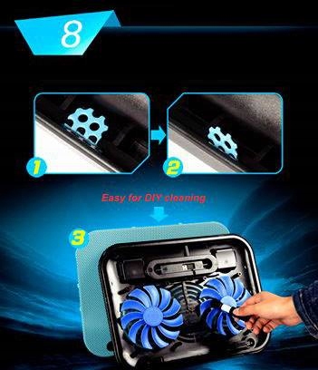 Подставка для ноутбука отличается прежде всего современным внешним видом, устойчивой конструкцией и эффективной системой вентиляторов. Расположение вентиляторов обеспечивает идеальное и эффективное охлаждение ноутбука независимо от расположения нагревающихся компонентов ноутбука (процессор, видеокарта, системы питания, жесткие диски). Широкая совместимость с ноутбуками и ноутбуками с различными размерами матриц 12, 13, 14, 15,6, 16, 17 дюймов. Конструкция позволяет использовать подставку на коленях. Гидравлические подшипники работают очень тихо . Нижняя часть основания имеет дополнительные ножки для увеличения угла наклона и обеспечения максимально возможной эргономичности работы.