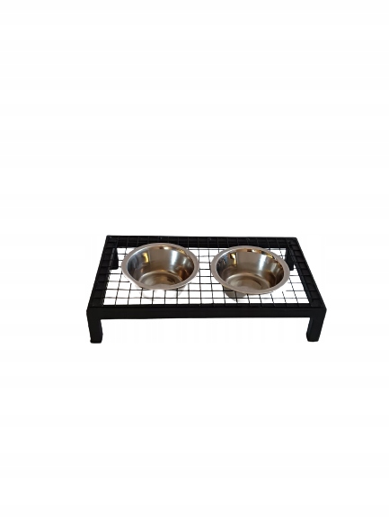 Конструкция стенда выполнена из закрытых профилей 15х15, обтянутых сеткой, окрашенной в черный цвет. В комплект входят две чаши емкостью 2х0,22л из нержавеющей стали. Подставка для миски подходит для собак, кошек и других животных. Ножки подставки отделаны пластиковыми заглушками.