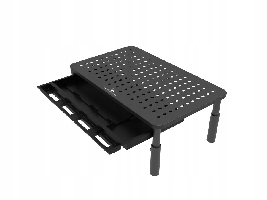 Стойка оснащена выдвижным ящиком для облегчения организации рабочего места. В нем можно хранить мелкие предметы, например ручки, блокноты или кабели, что помогает поддерживать порядок на столе. Противоскользящие ножки стабилизируют конструкцию подставки, предотвращая ее перемещение во время использования.