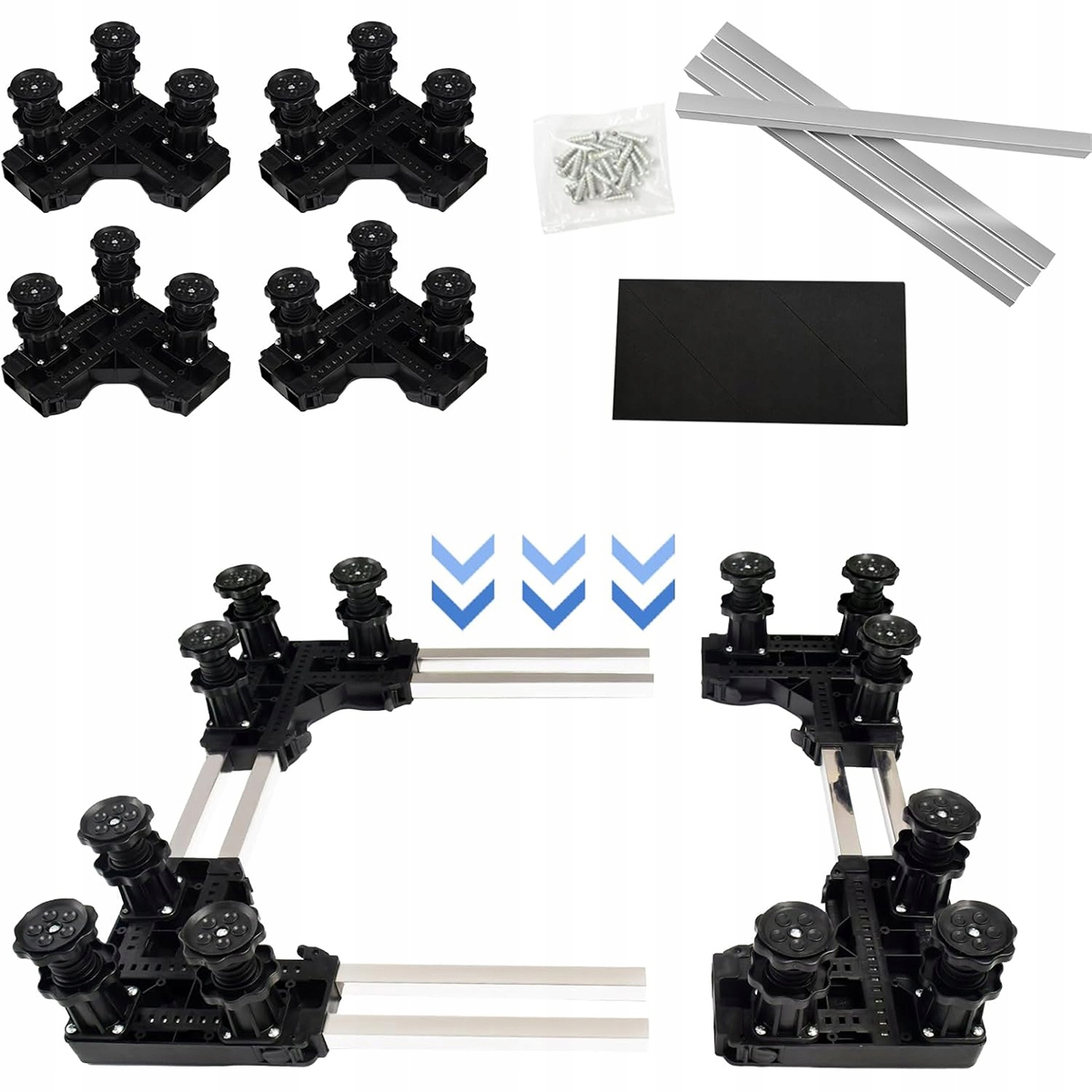 - Простая и эффективная установка: установить эту подставку для стиральной машины чрезвычайно просто. Сначала прикрепите винтами четыре ножки базовой рамы. Затем вы можете легко отрегулировать высоту, поворачивая их. Чтобы определить длину и ширину, расстегните пряжку и воспользуйтесь рулеткой. Не забудьте застегнуть пряжку после внесения изменений. Еще одним преимуществом является возможность самостоятельного монтажа подставки, что повышает гибкость и простоту установки.