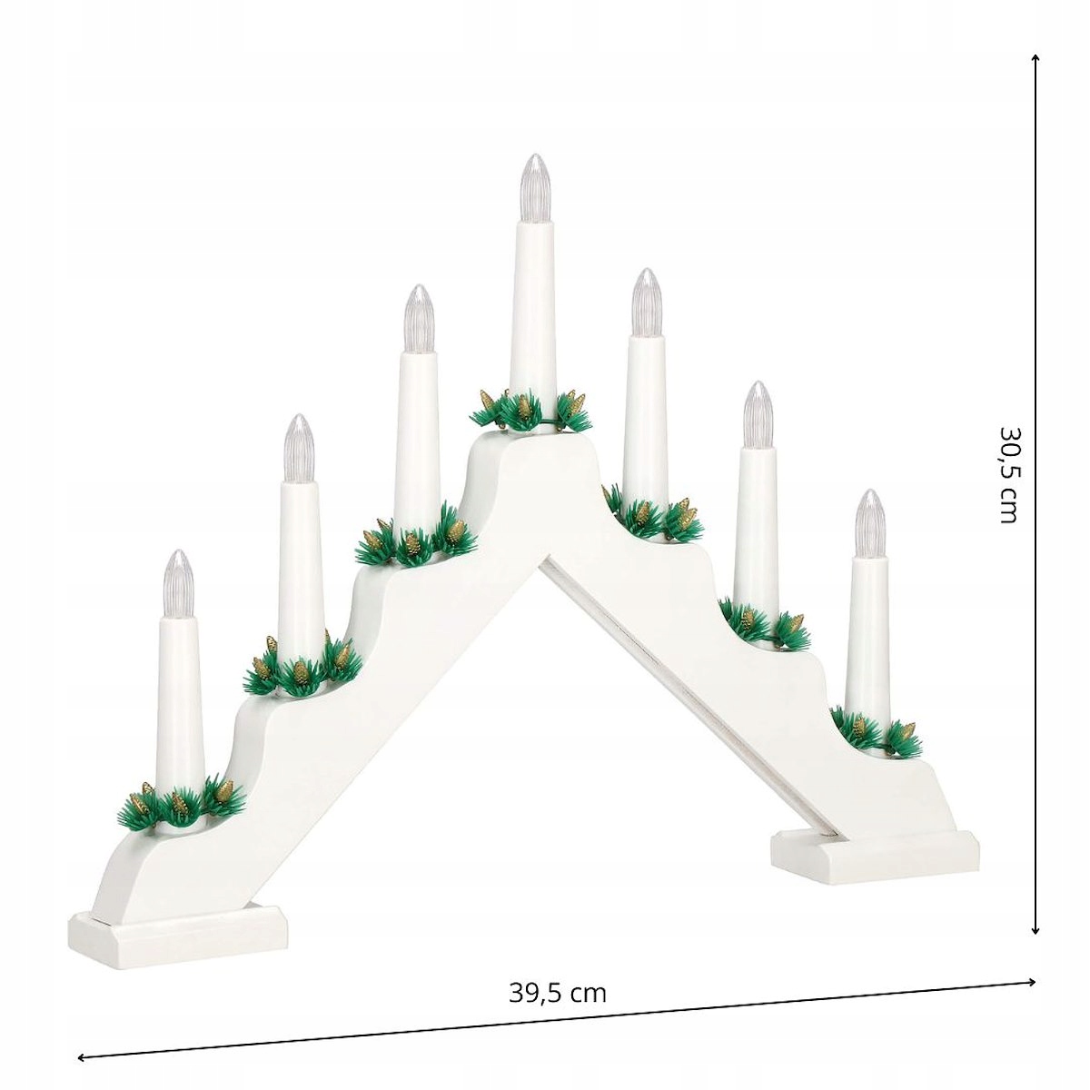 Подсвечник Advent от Springos имеет высоту 30,5 см и ширину 39,5 см. На подсвечнике 7 искусственных свечей. Каждый из них был украшен зеленым венком из пяти сосновых шишек. Вся штука белая.
