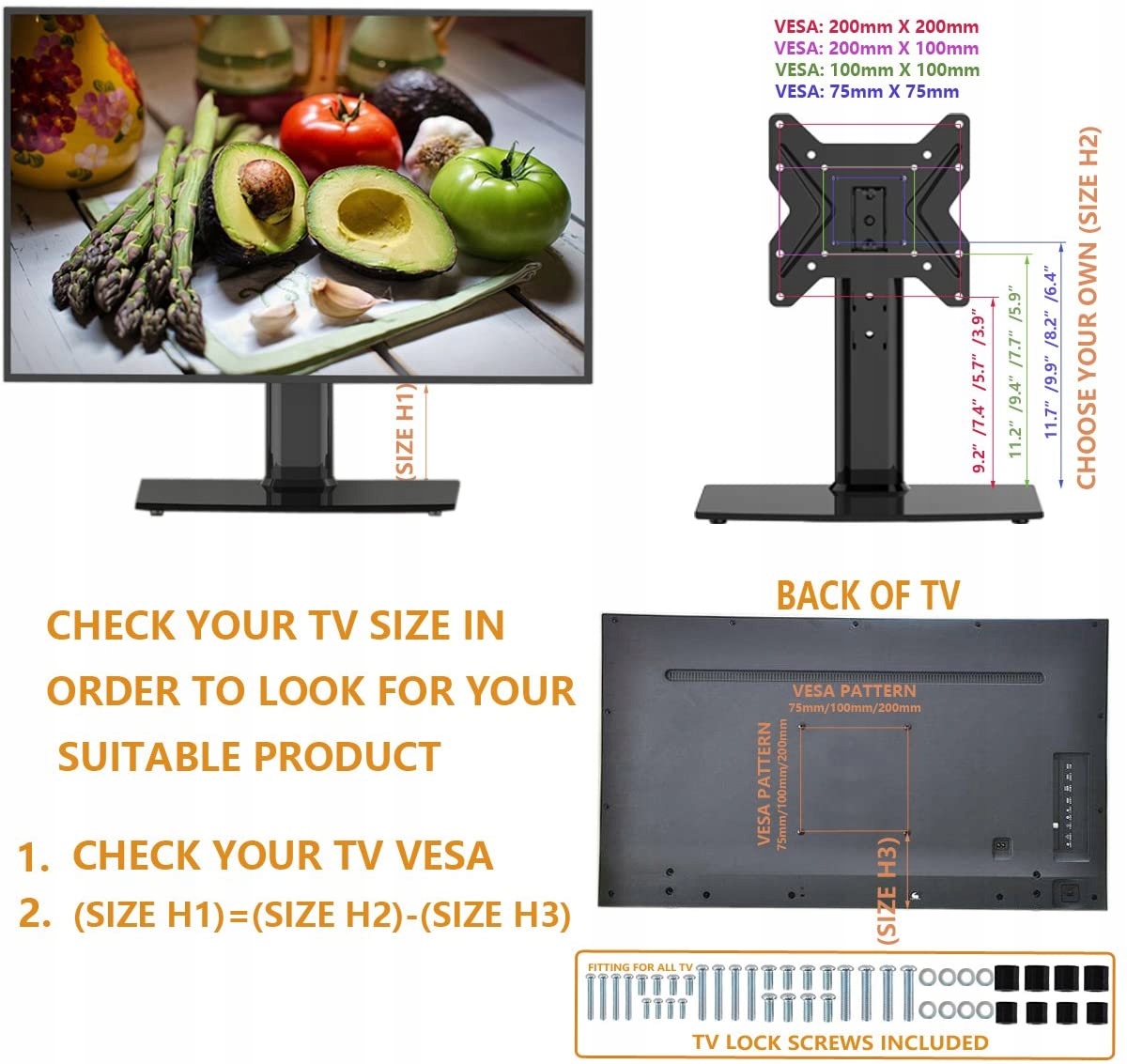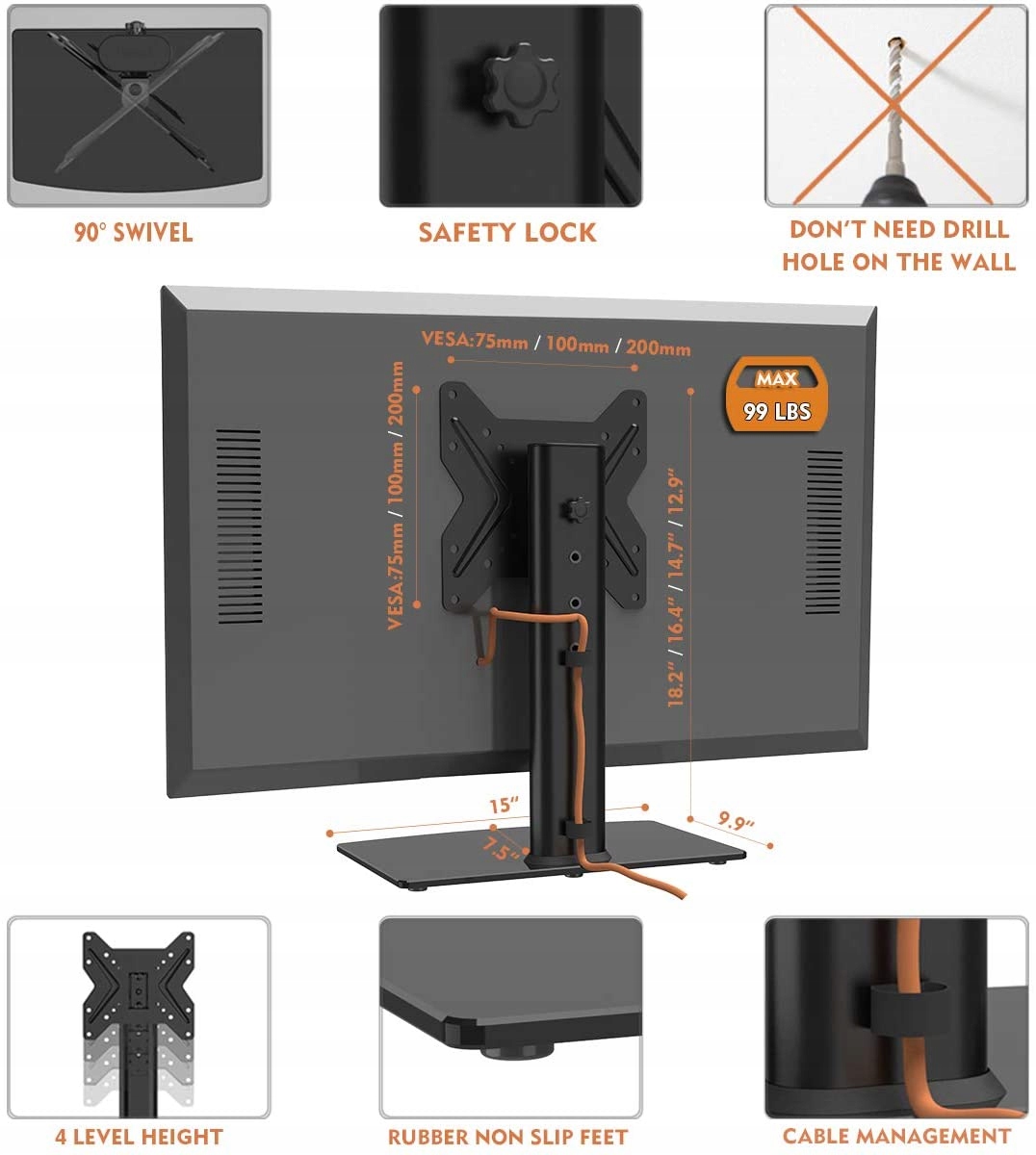 - СТАБИЛЬНОСТЬ И МНОГОФУНКЦИОНАЛЬНОСТЬ ПРИМЕНЕНИЯ УНИВЕРСАЛЬНАЯ ПОДСТАВКА ДЛЯ ТВ ☞ Благодаря прочной эллиптической стальной панели и основанию из закаленного стекла толщиной 8 мм мое устойчивое отдельно стоящее крепление для телевизора легко удерживает телевизор на столе. , сохраняя его в безопасности и устойчивости, а также моя универсальная подставка для телевизора легко вмещает телевизоры с диагональю от 19 до 39 дюймов с рисунком VESA от 75 x 75 мм до 200 x 200 мм, выдерживает до 99 фунтов.