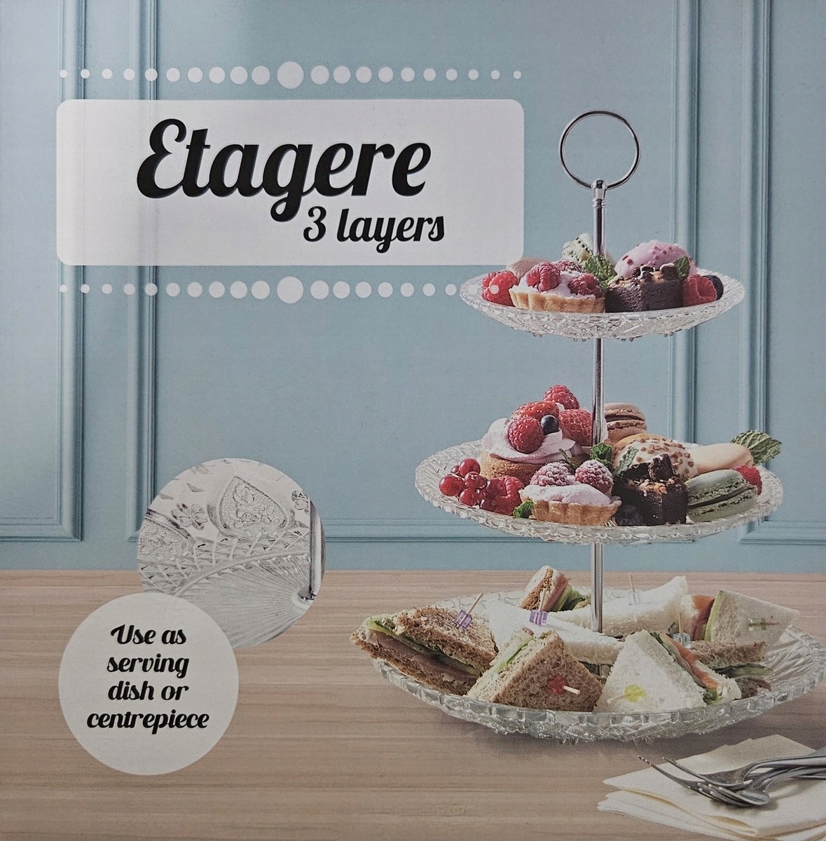 Откройте для себя элегантность и функциональность нашей стеклянной полки, которая привносит нотку роскоши в каждый дом. Этот стильный предмет имеет три стеклянных яруса, которые идеально подходят для демонстрации широкого ассортимента закусок, от вкусной выпечки до вкусных закусок. Стеклянная полка не только отлично выглядит, но и является практичным дополнением, которое украсит ваш сервировочный стол.