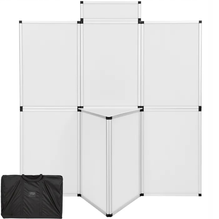 Рекламные стены можно использовать в качестве перегородок на выставках или использовать универсально. Плакаты можно легко прикрепить к стене, поэтому стену можно использовать в качестве экрана. Кроме того, складная стенка включает в себя столик, на котором можно разместить продукцию, образцы или визитные карточки. Быстрая и легкая сборка и легкая транспортировка.