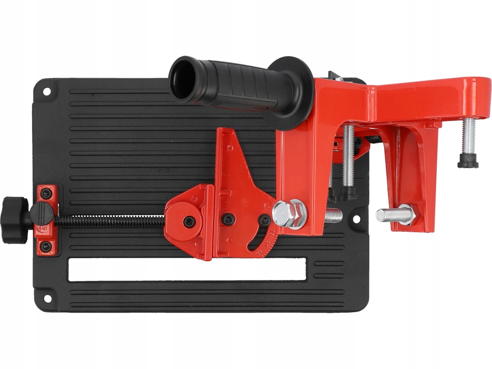 Универсальный штатив для работы с УШМ. Устойчивое основание из литой стали оснащено прочными быстрозажимными тисками. Опорные профили большого сечения и двойная возвратная пружина позволяют использовать тяжелую шлифовальную машину. Горизонтальный угол резания точно устанавливается благодаря ручкам.