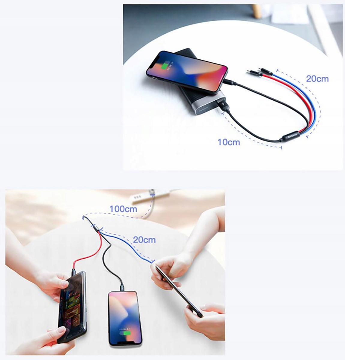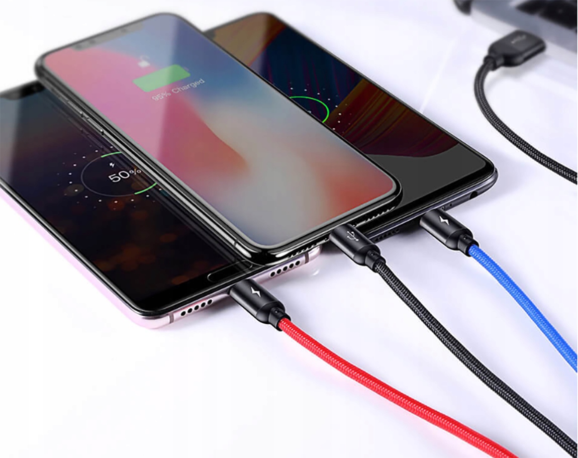Высококачественный кабель позволяет быстро и легко заряжать три устройства одновременно — с разъемами USB Type-C, Lightning и Micro USB. Каждый провод имеет свой цвет, поэтому их легко отличить. Алюминиевые наконечники характеризуются высокой прочностью, а нейлоновая оплетка устойчива к повреждениям и истиранию, а также предотвращает запутывание кабеля. Входящая в комплект стяжка позволяет легко хранить и упорядочивать кабель. Кабель имеет интеллектуальную систему управления, которая подстраивает соответствующее напряжение для конкретного устройства, что обеспечивает оптимальное и безопасное возобновление энергии в соответствии с потребностями данного смартфона. Кабель 3-в-1 — идеальное решение для людей, у которых есть устройства с тремя разными портами питания.