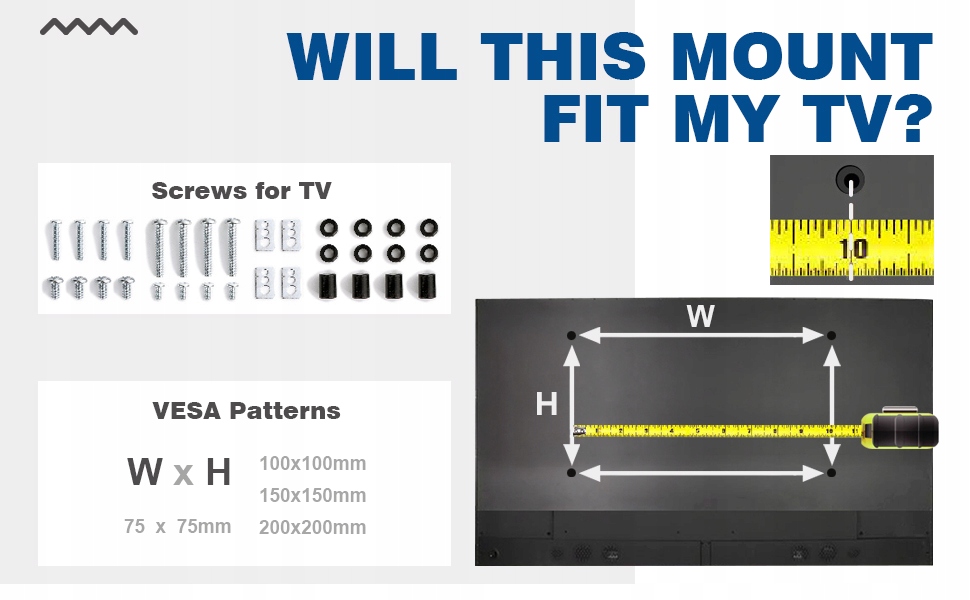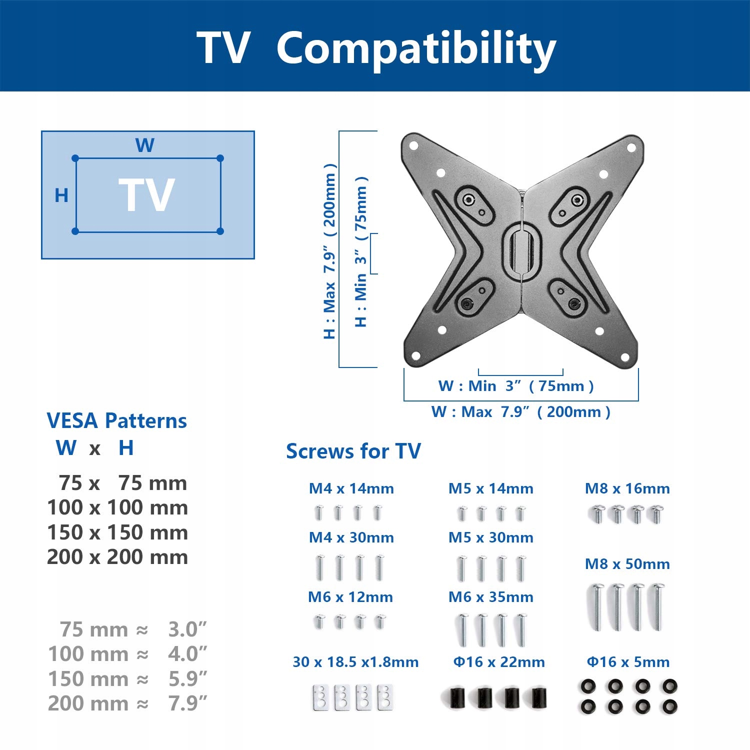 - Как проверить, подходит ли эта подставка для моего телевизора? Сначала проверьте вес вашего телевизора. Он должен быть не более 25 кг. Во-вторых, убедитесь, что у вашего телевизора есть четыре монтажных отверстия сзади и что этот кронштейн поддерживает следующие размеры отверстий для винтов VESA: 75x75, 100x100, 150x150, 200x200 мм. Рекомендуемый размер телевизора: 13, 16, 19, 20, 22, 24, 26, 27, 32, 37, 40, 42, 43 дюйма.