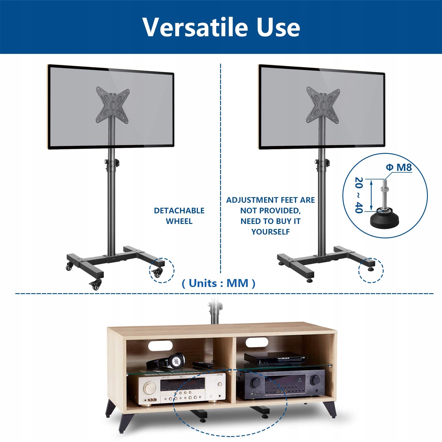 - RFIVER Подставка для телевизора на колесиках Тележка для телевизора 13–43 дюйма Тележка для телевизора Тележка для телевизора Роликовая подставка для телевизора с колесами Подвижная регулируемая высота Макс. VESA 200x200 мм Пожалуйста, введите свою модель, чтобы убедиться, что этот товар подходит. СОВМЕСТИМОСТЬ ТЕЛЕВИЗОРА — Совместимость с VESA: 200x200/150x150/100x100/75x75 мм. Для большинства маленьких телевизоров, таких как 13, 16, 19, 20, 21, 22, 24, 25, 26, 27, 30, 32, 37, 39, 40, 42, 43 дюйма, плоский и изогнутый ЖК-телевизор со светодиодной подсветкой и OLED, максимум 25 кг.? РЕГУЛИРУЕМАЯ ВЫСОТА - Эта мобильная подставка для телевизора регулируется по высоте, от верха пластины до пола максимум 1362 мм.ROLLBAR - Тележка для ТВ RFIVER с 4 сверхпрочными роликами на 360°, 2 колесами, оснащенными ножными стояночными тормозами на Передняя часть делает тележку стационарной или мобильной ОСНОВА - Прочная стальная рама обеспечивает долговечность и устойчивость. Основание с роликами имеет высоту около 100 мм. Мобильную подставку под телевизор можно разместить отдельно или за тумбочкой под телевизор. Вы можете задвинуть основание под стол.? УСТАНОВКА - В комплект поставки входят: складная подставка для телевизора со всеми необходимыми винтами, инструкция по сборке. Сборка не вызывает затруднений благодаря систематической упаковке и маркировке деталей.