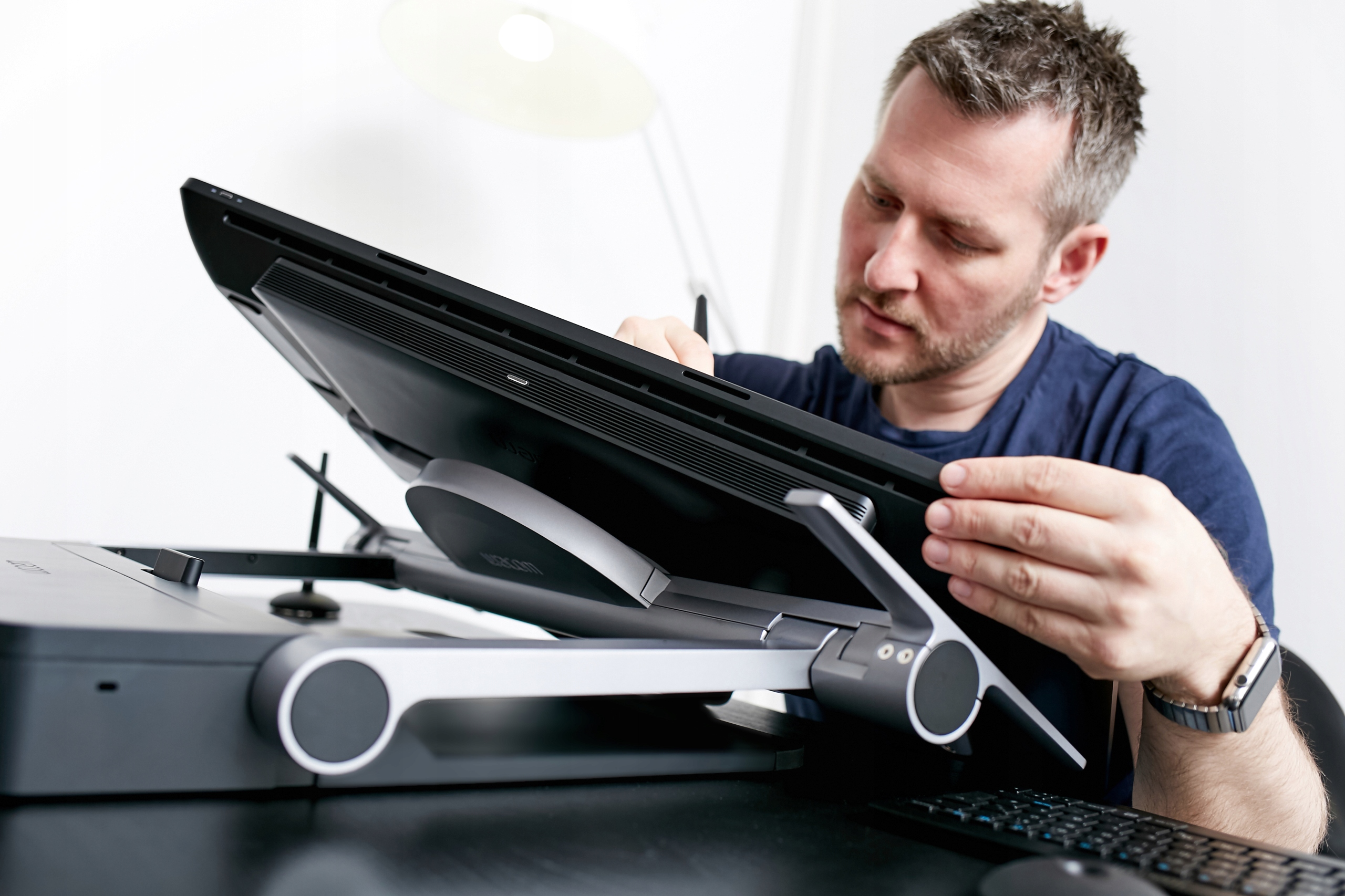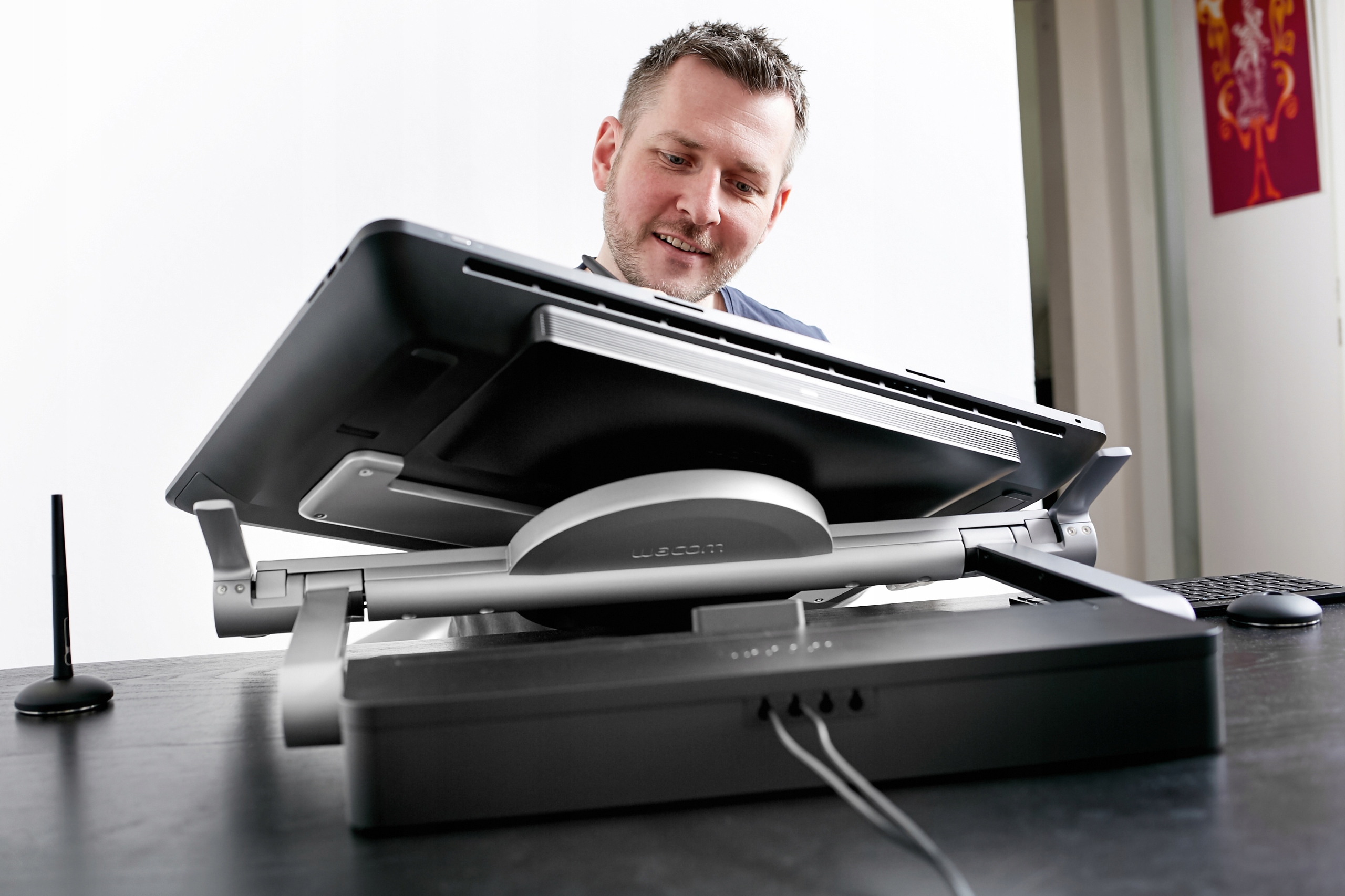 - Прикрепив Cintiq Pro 24 к основанию Ergo Stand, вы можете поднимать/опускать положение экрана одной рукой.