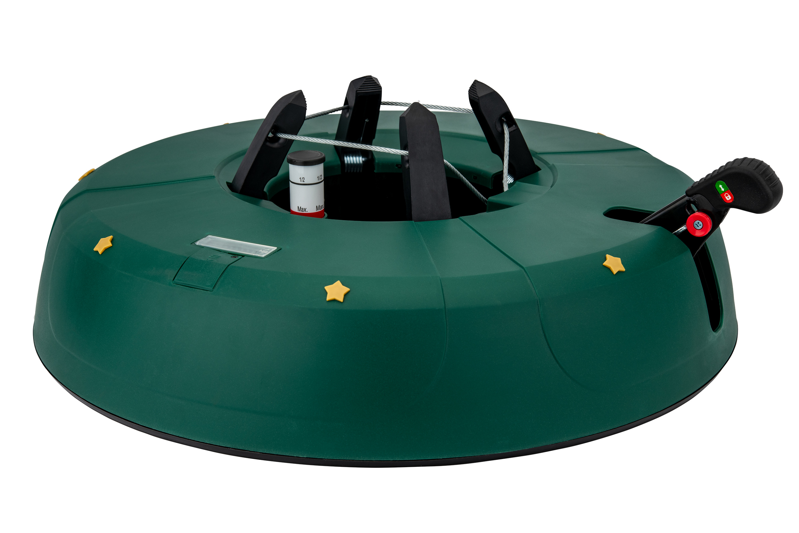 Подставка для елки имеет проверенный прижимной механизм, благодаря которому елка стоит устойчиво. Блокировка от детей повышает безопасность использования. Большой резервуар для воды с двумя индикаторами наполнения позволяет контролировать количество воды. Стенд рассчитан на деревья максимальной высотой 4,5 м.