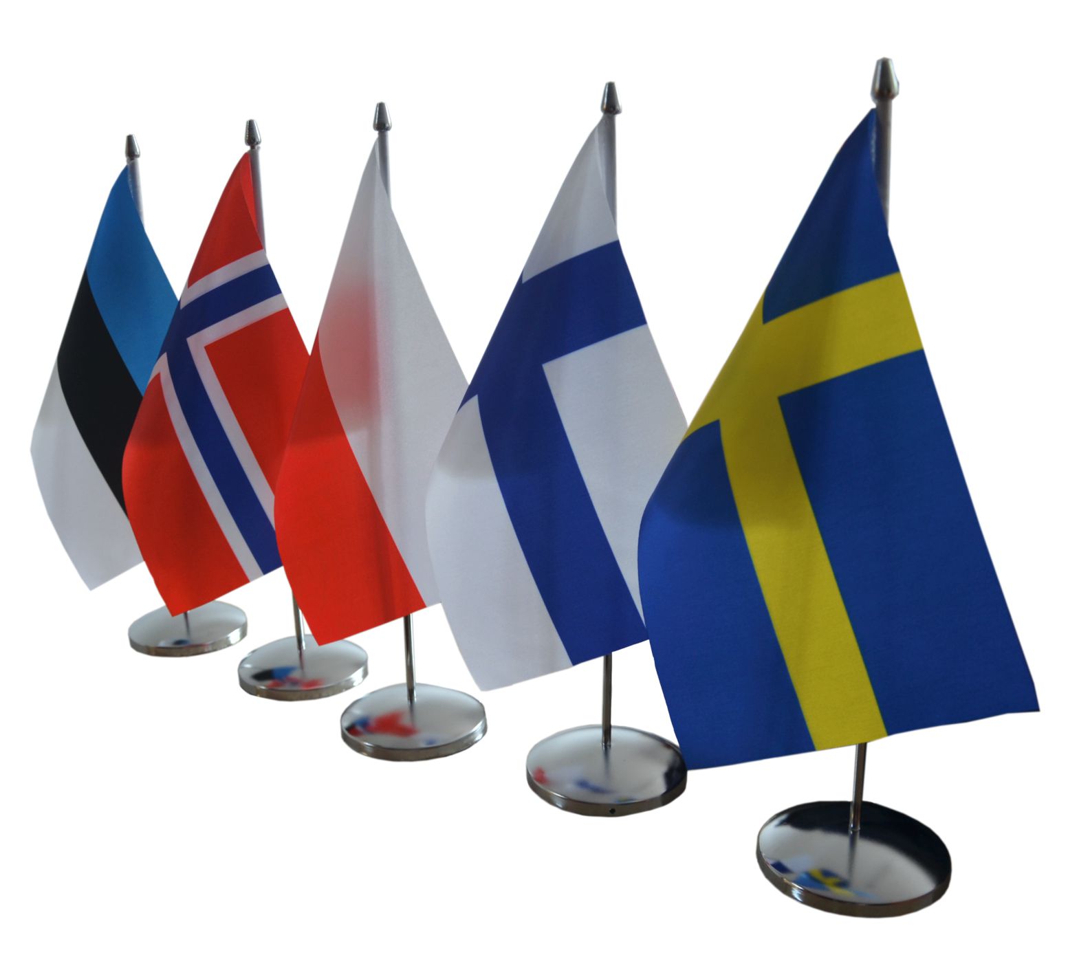 Офисная подставка из полированной никелированной стали с двумя атласными флагами любой страны или с вашим принтом.