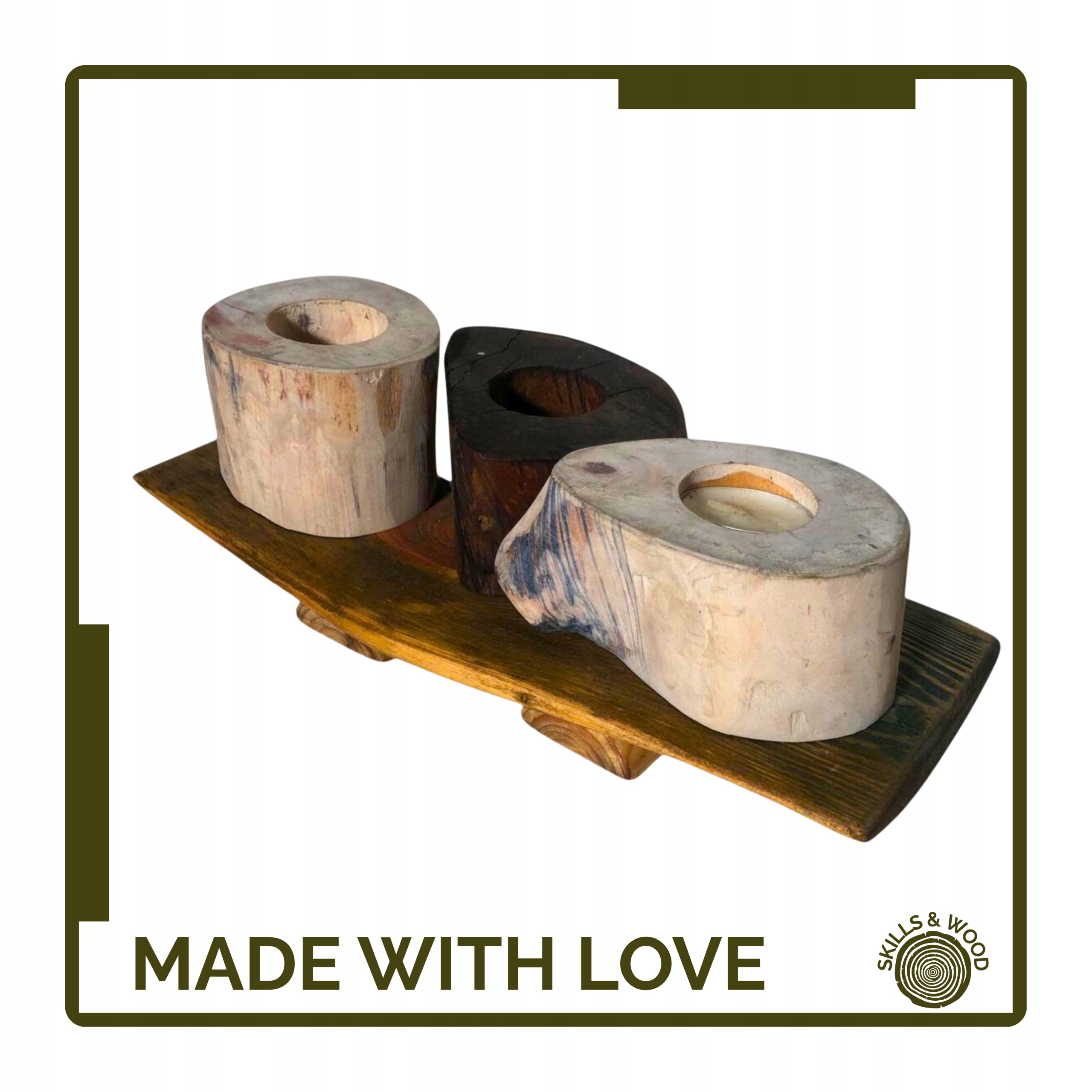 Уникальный подсвечник с тремя свечами, изготовленные из смешанной древесины и отделанные натуральными маслами и воском. Каждая копия - ручной работы - уникальный, с характерной планировкой банок и цветов.