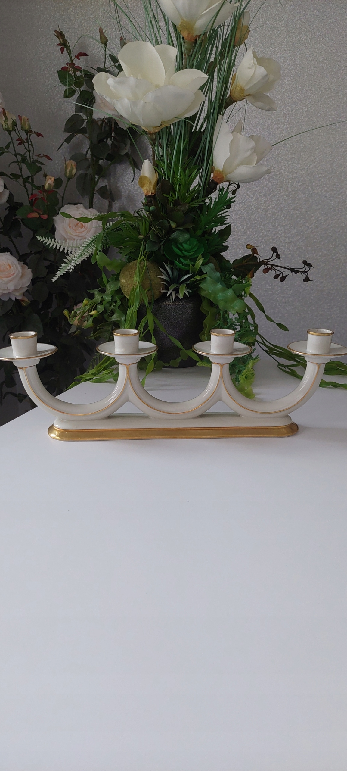 Подсвечник цвета экрю, размеры: высота 12см, длина 40см. На фото подсвечник имеет повреждения, в остальном очень хорошее состояние.