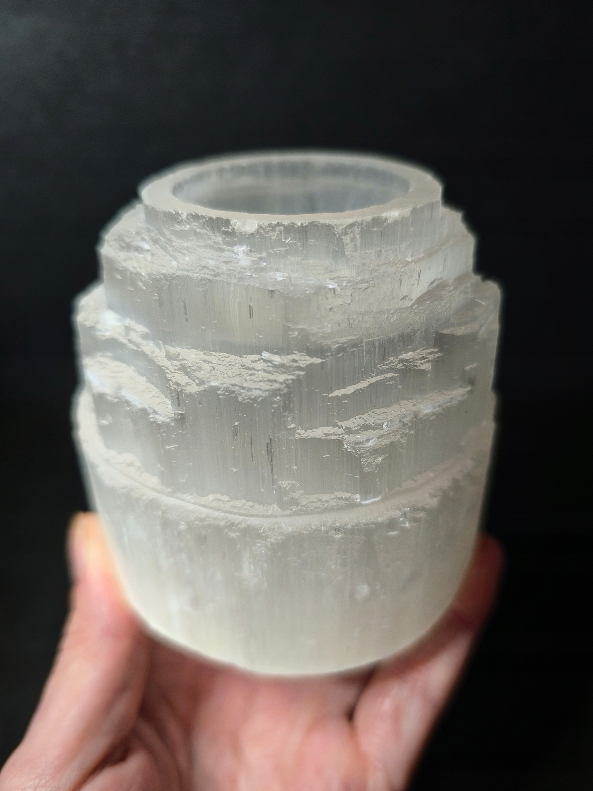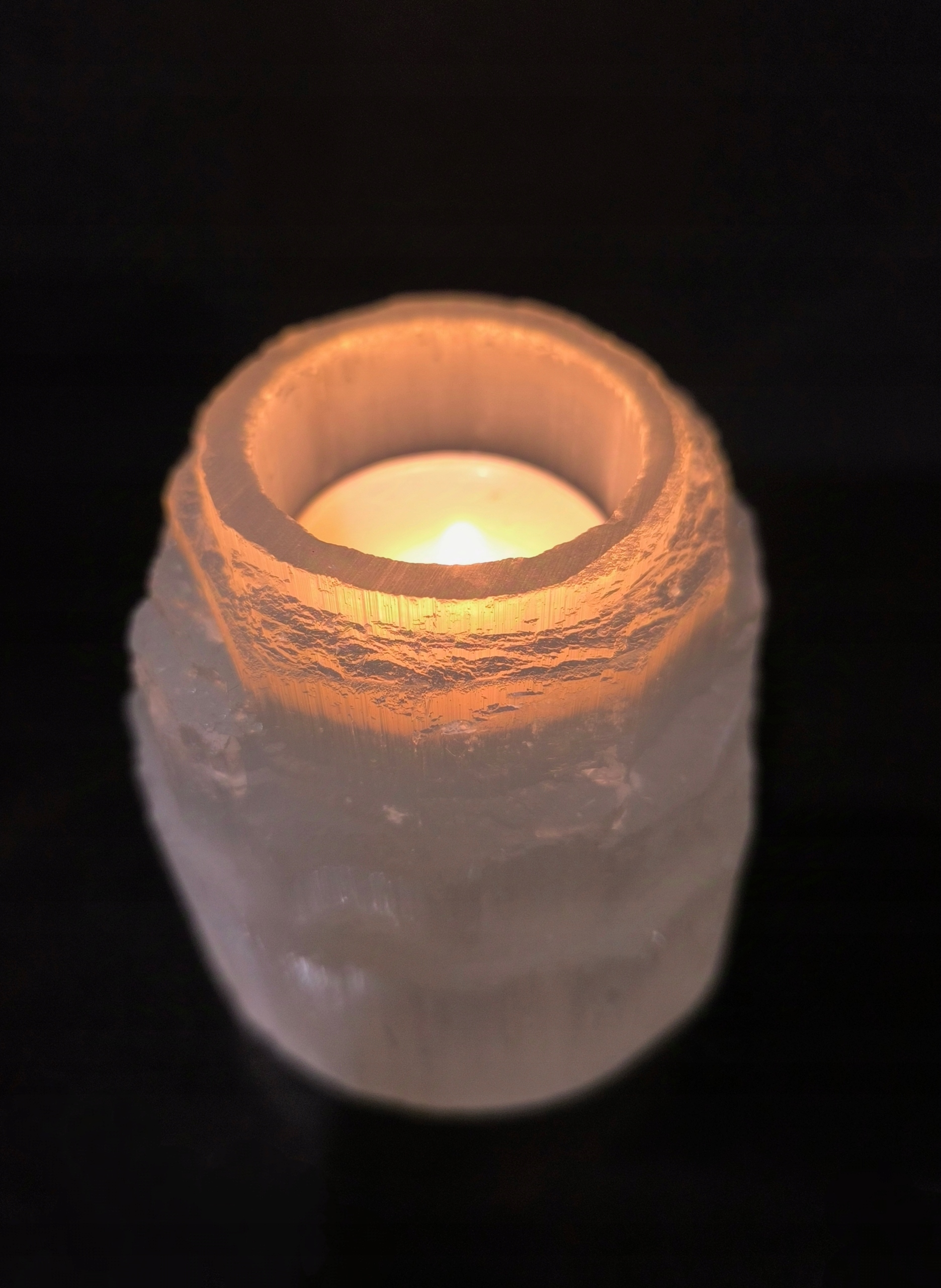 Предмет продажи — подсвечник из селенита — природного волокнистого гипса, обладающего необычным, лунным свечением. Этот минерал еще называют лунным камнем. Размеры отверстия идеально подходят для подогревателей для чайных свечей.