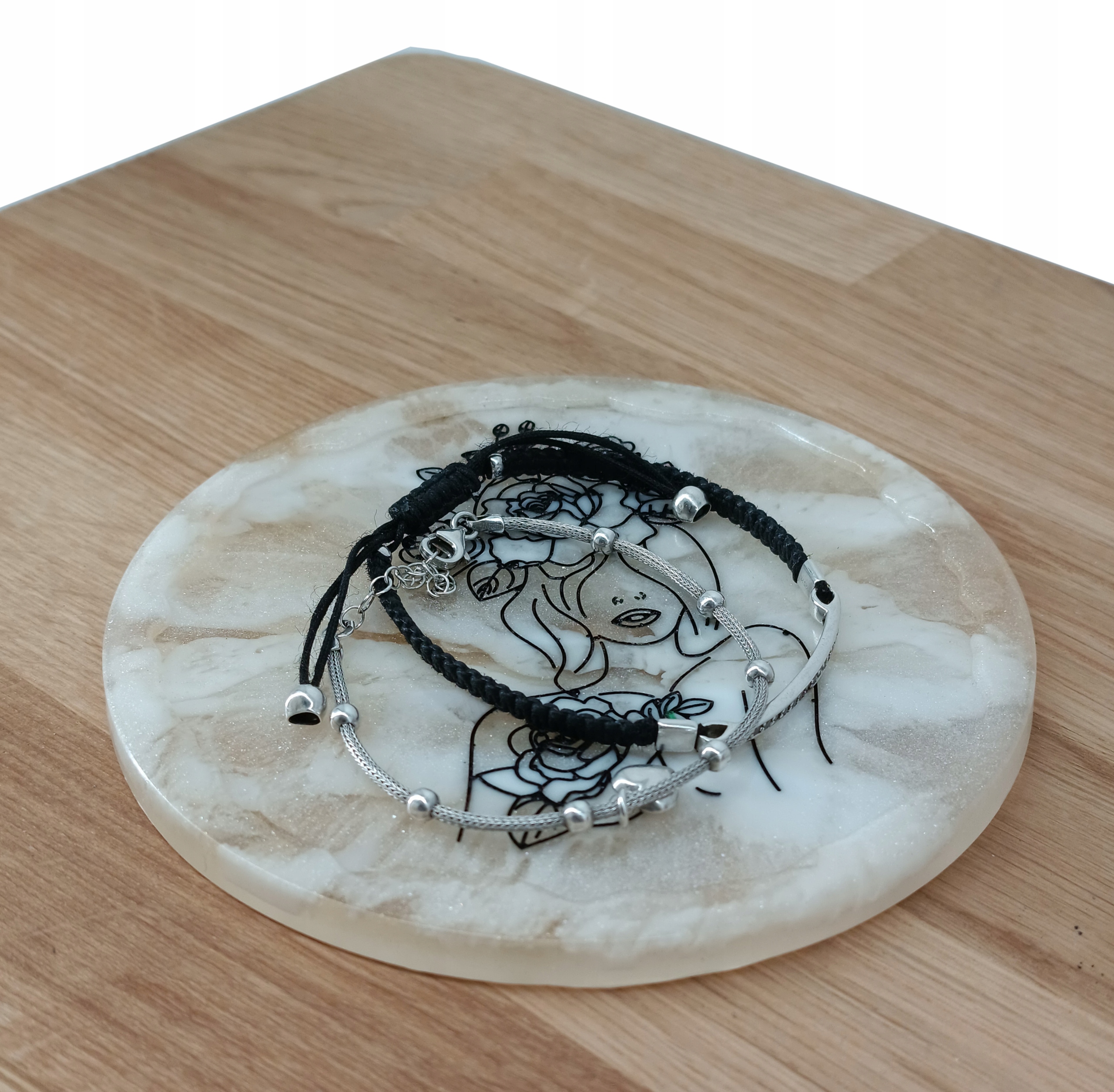 Засушенные лепестки цветов залиты натуральной смолой. Край подставки отделан декоративными разноцветными камнями. Женский мотив и украшения, выгравированные золотой краской.