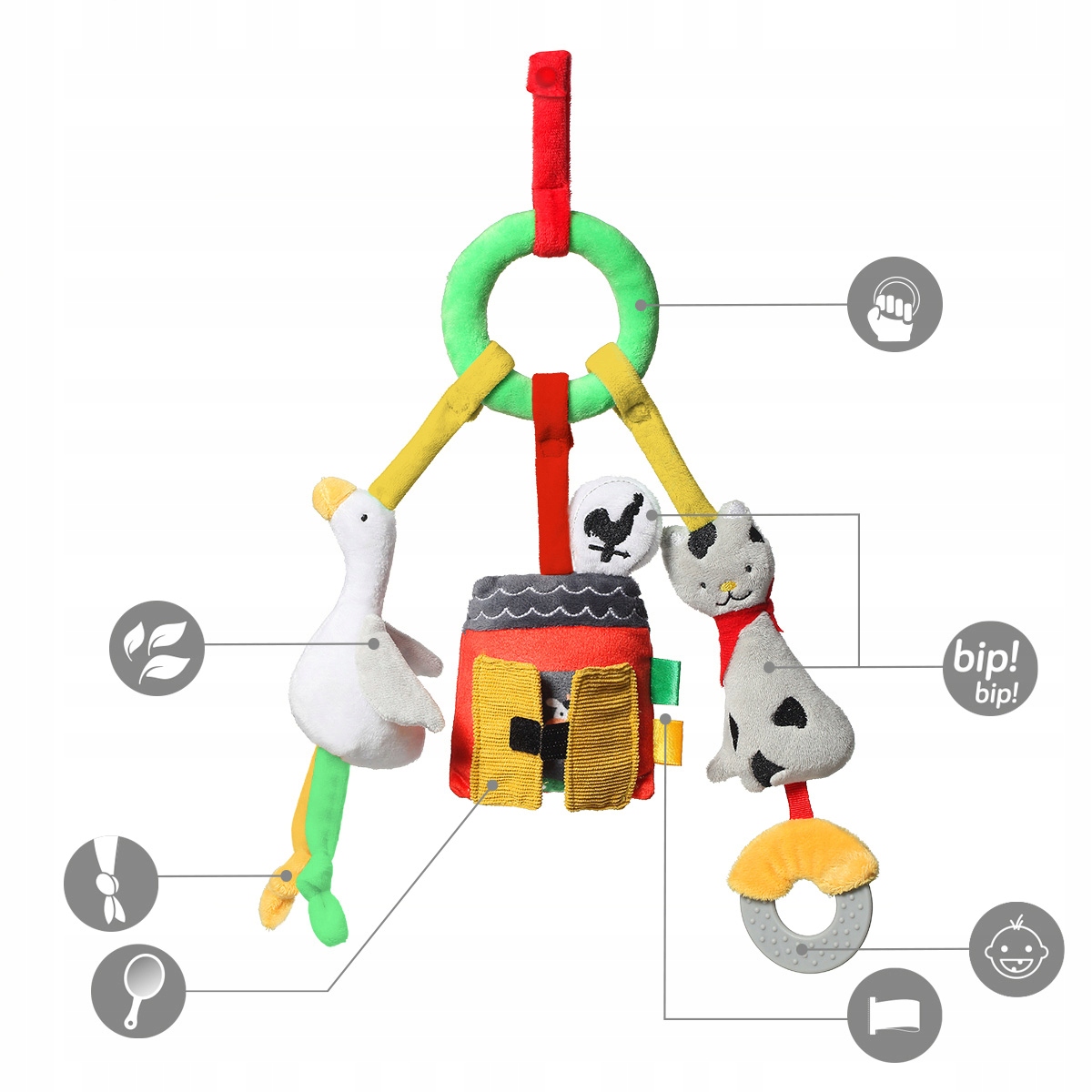 Мягкие силиконовые прорезыватели, входящие в комплект игрушки, успокаивают раздраженные десны во время прорезывания первых зубов.