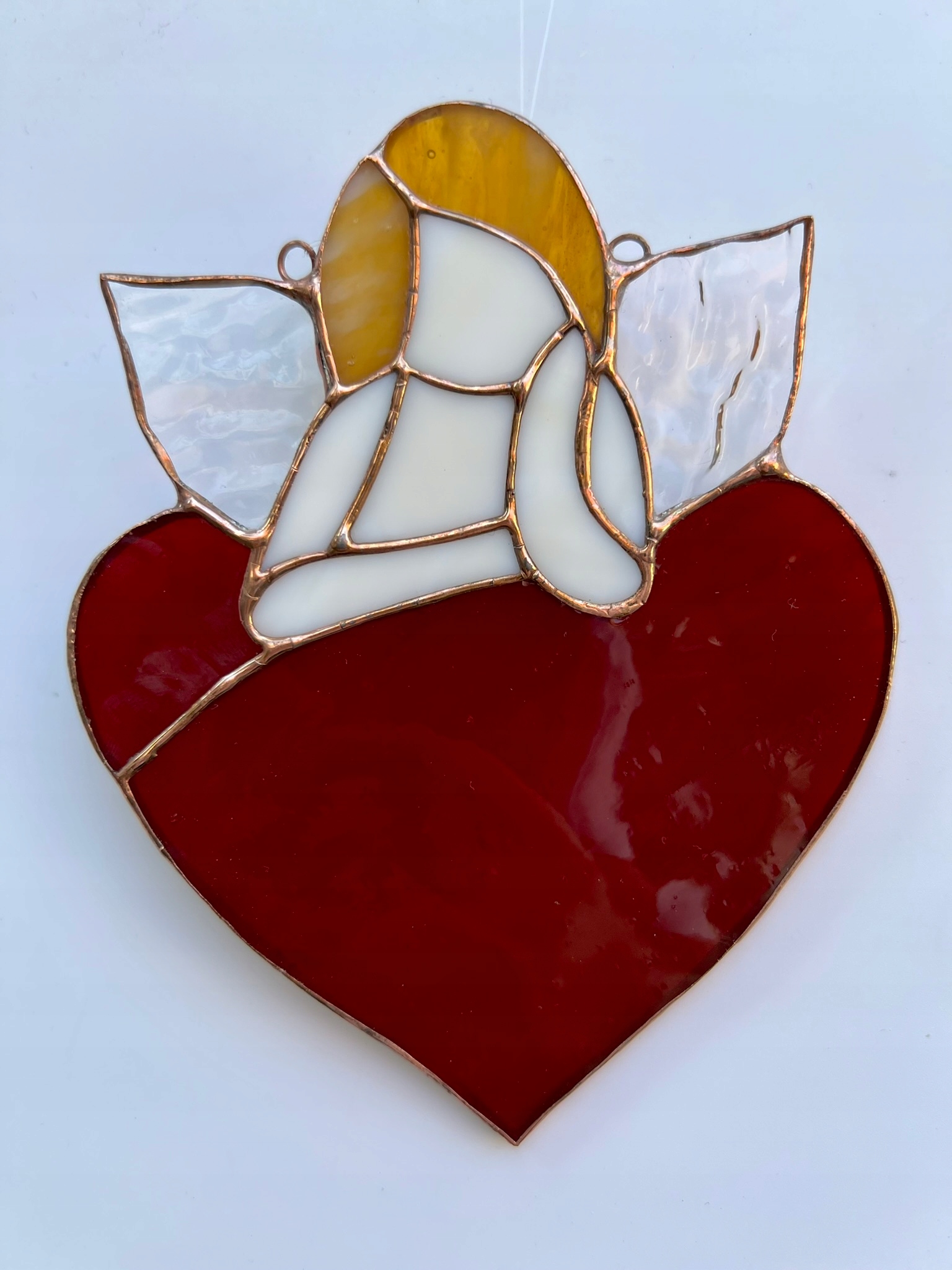 Оригинальный кулон, выполненный в традиционной технике Тиффани - ангелочек с глубоким, благородным сердцем из витражного стекла. Каждое стекло вырезается, полируется и паяется вручную, благодаря чему каждое изделие приобретает уникальную структуру и игру света. Это небольшое произведение искусства - прекрасно подойдет в качестве личного талисмана, уникального подарка или художественного акцента на витрине.