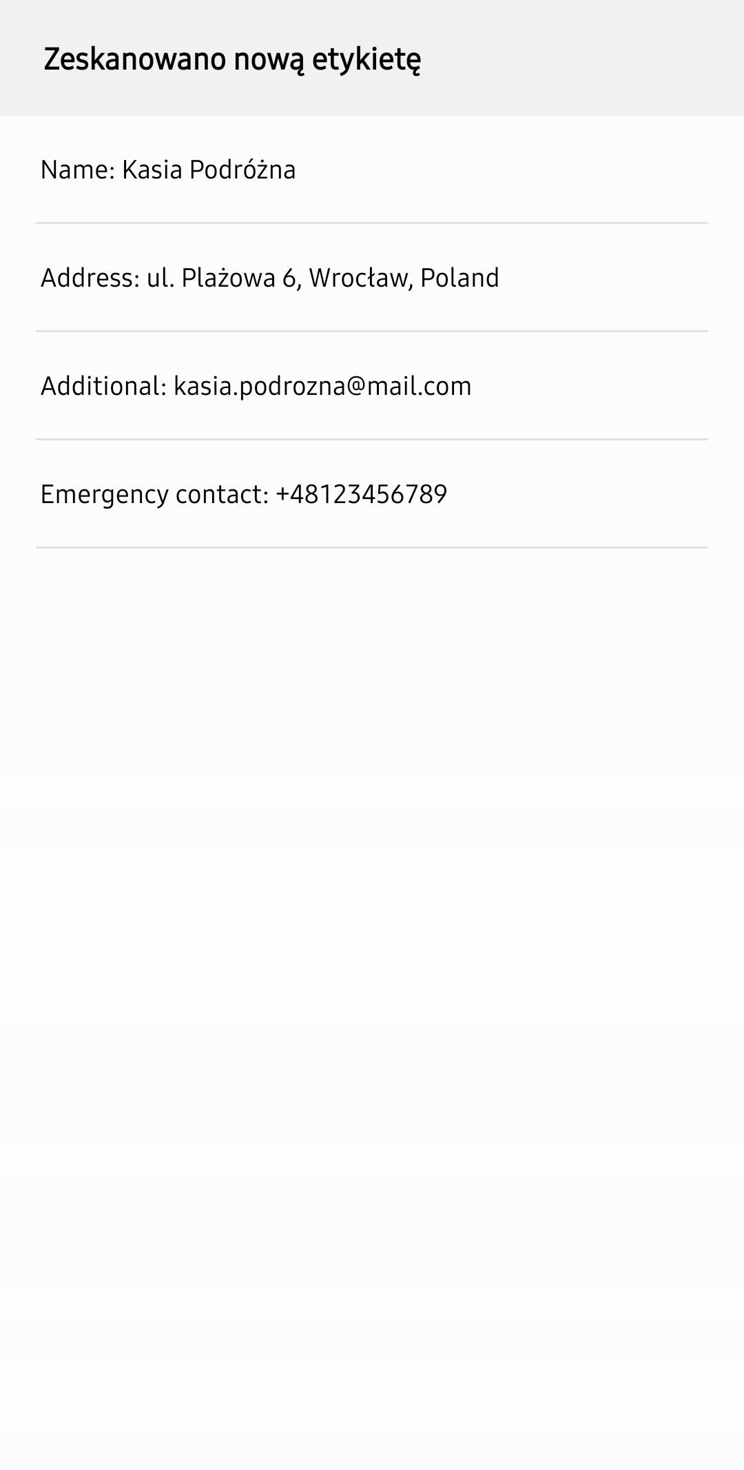 Тег может содержать контактные данные: номер телефона, адрес электронной почты, ссылку, адрес или любой другой контент. При поднесении телефона к подвеске данные владельца отображаются автоматически.