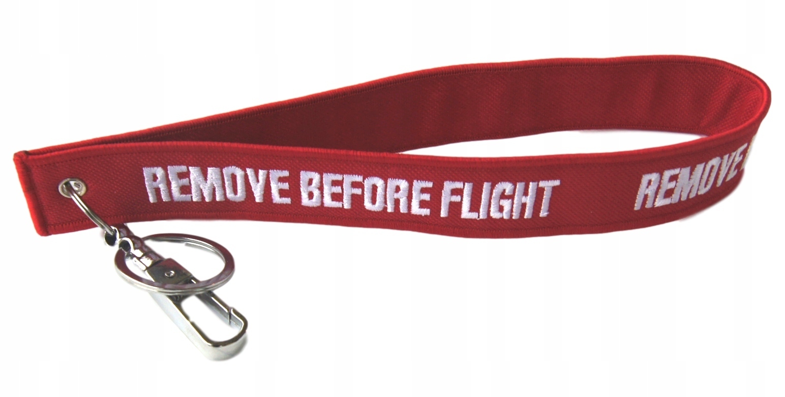 По всей длине поводка три вышитые надписи - REMOVE BEFORE FLIGHT