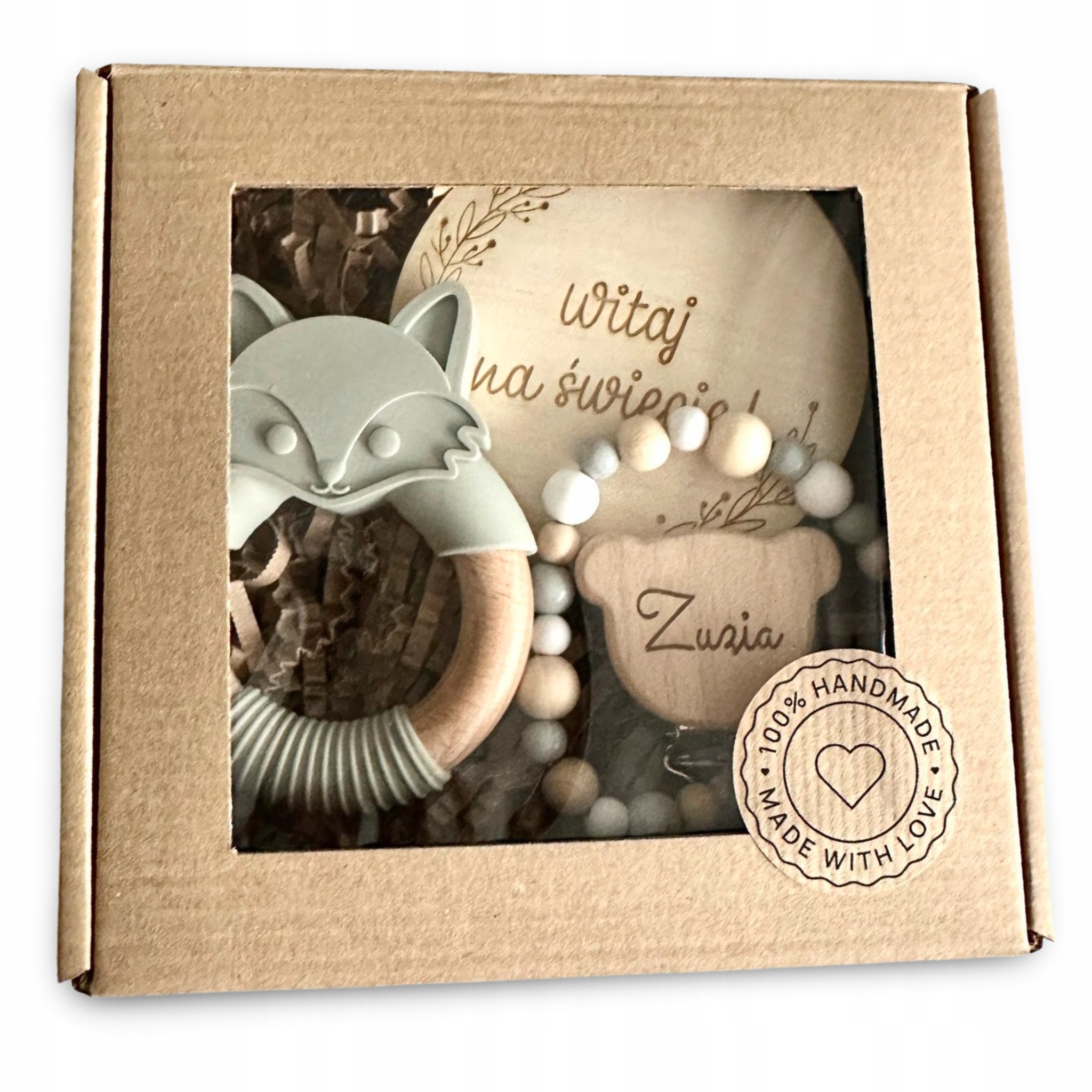кулон-пустушка з ім'ям, прорізувач для зубів Fox.Набір для душу дитини, гравіювання по дереву