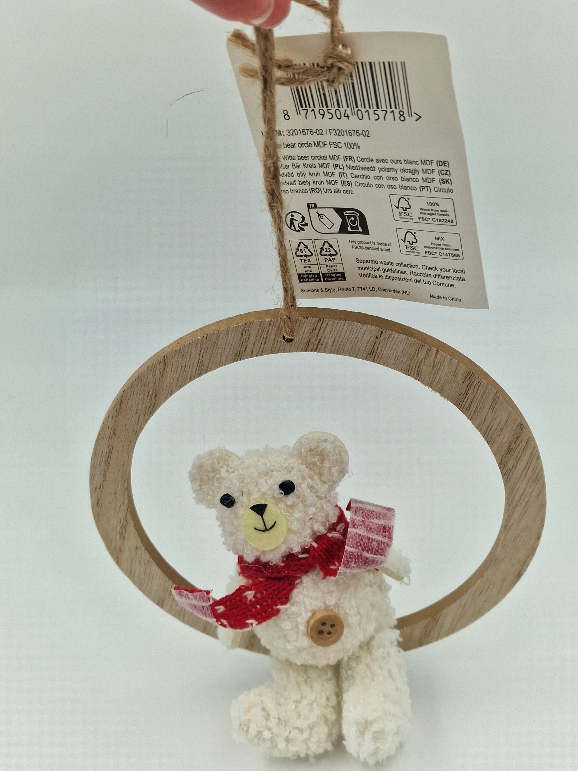 Очаровательное рождественское украшение в виде мягкого белого плюшевого мишки, вплетенного в деревянный круг. Медведь одет в красный шарф с декоративной лентой и кнопкой на животе. Целое подвешено на естественной струне - готово украсить елку, окно или праздничный тростник.