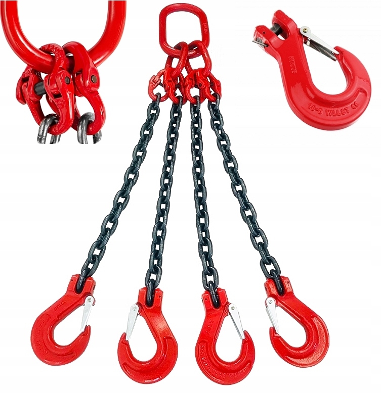 4-х ветвевой цепной строп с собирающим звеном/размеры. звенья 135 х 74 мм и 54 х 25 мм - малые/с вилочными крючками с защитой от отсоединения троса, закрепленного защелкой.