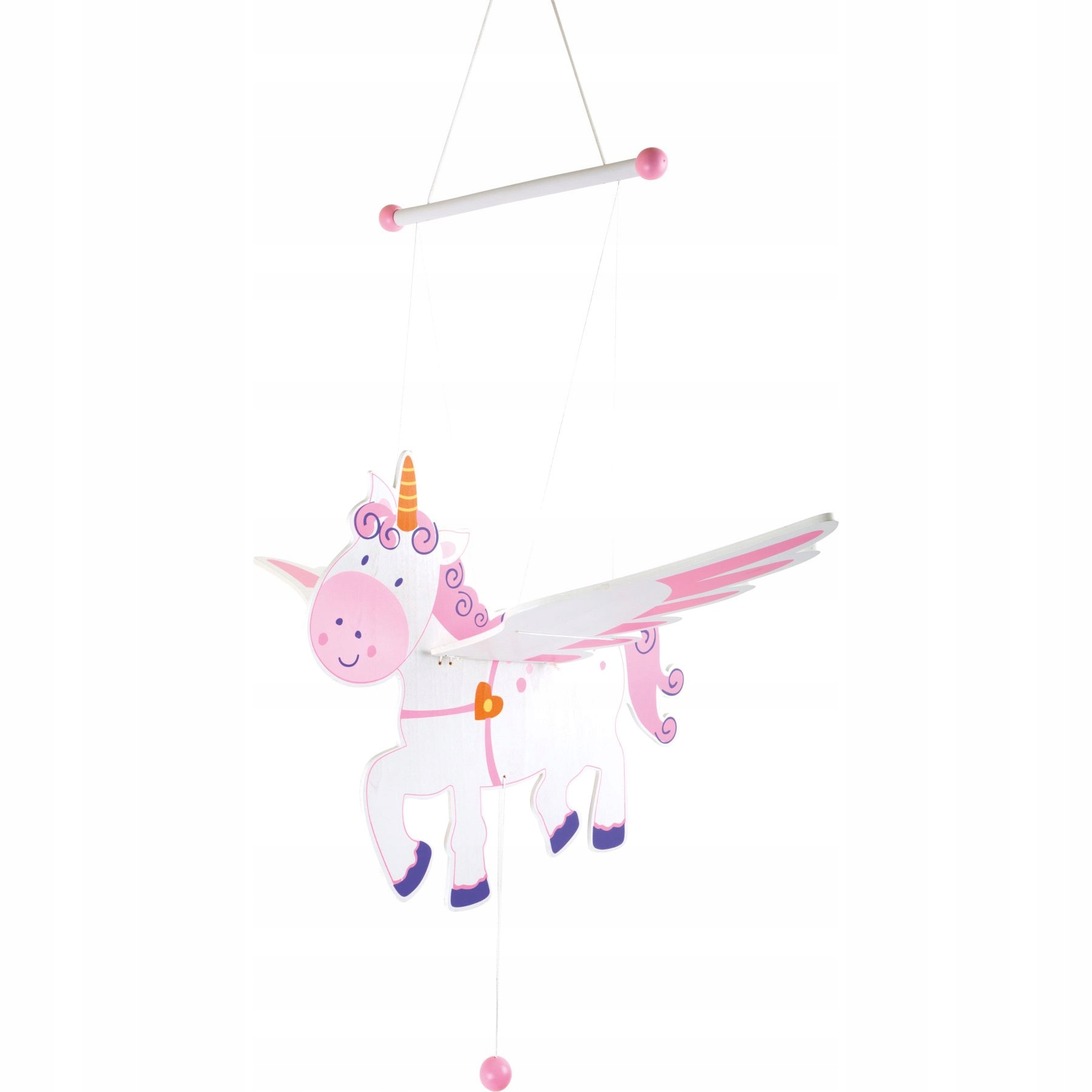 Единорог был сделан из дерева. Он белого цвета с сильным розовым оттенком. Подвесить его следует так, чтобы ребенок мог привести в движение его внушительные крылья, потянув за веревку с красным шариком. Веселье будет радостным.