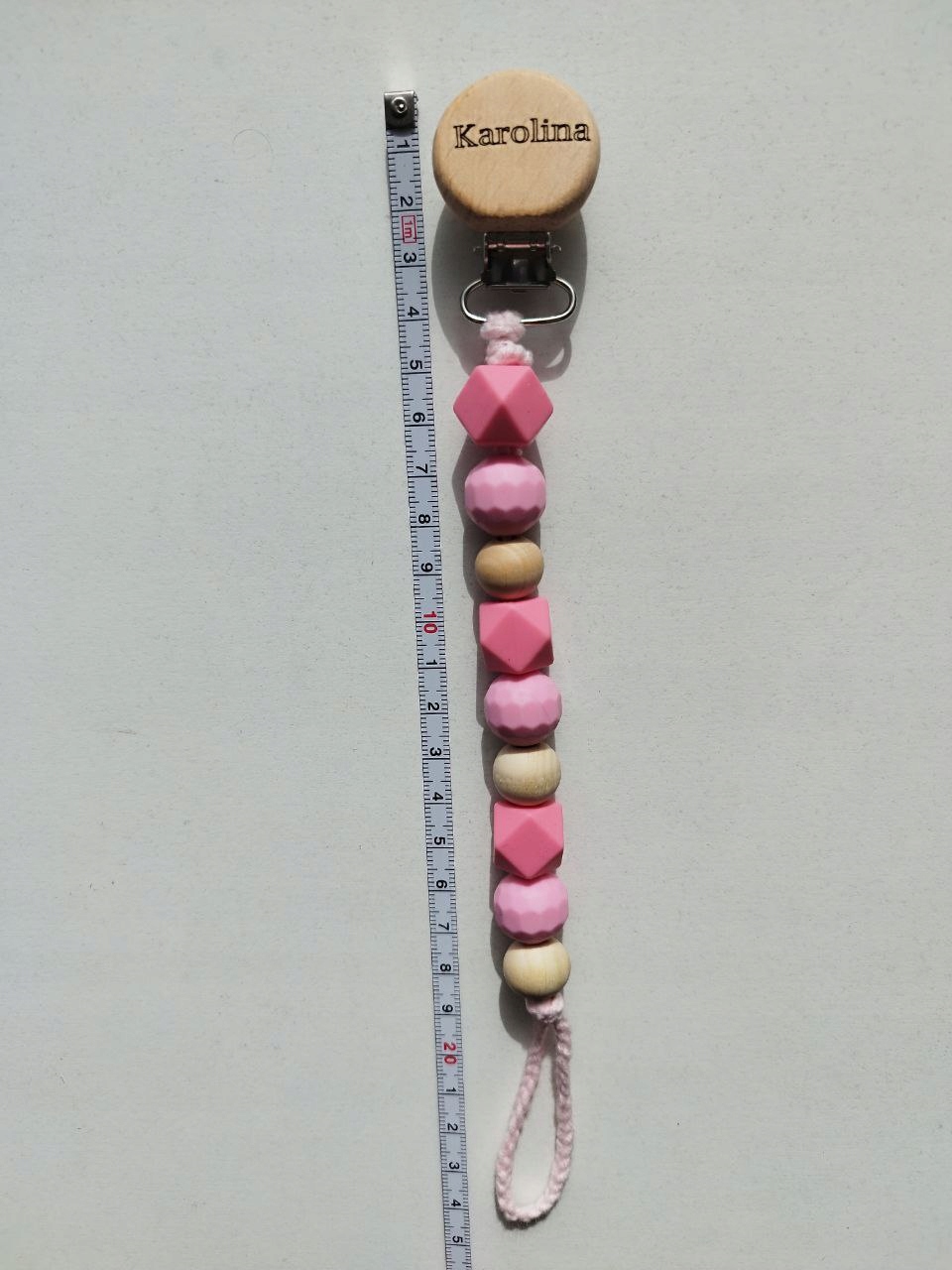 Предметом аукциона является персонализированный подвеска или подвеска для проведения. Кулон из дерева и силикона. Строка изготовлена ручным вязанием крючком. Это производство ручной работы , поэтому она сделана с осторожностью. Одежда очень хорошая. С зажимом около 23-24 см+-2 см