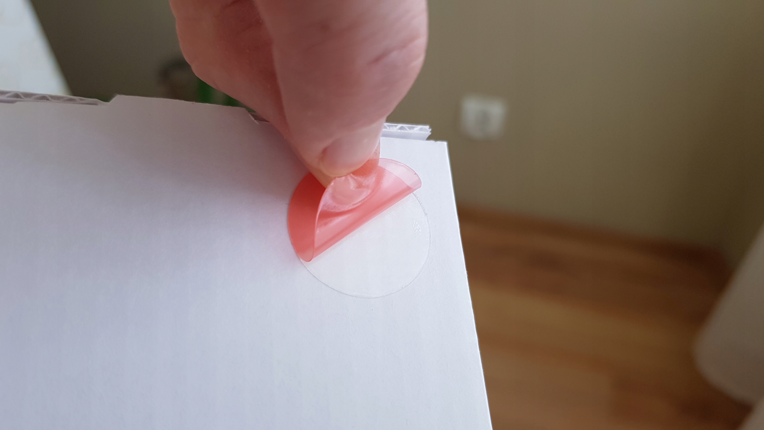 - приклеивание прочным двусторонним скотчем для крепления рекламных предметов (POS), после снятия красной защитной фольги клеевой слой становится прозрачным >.