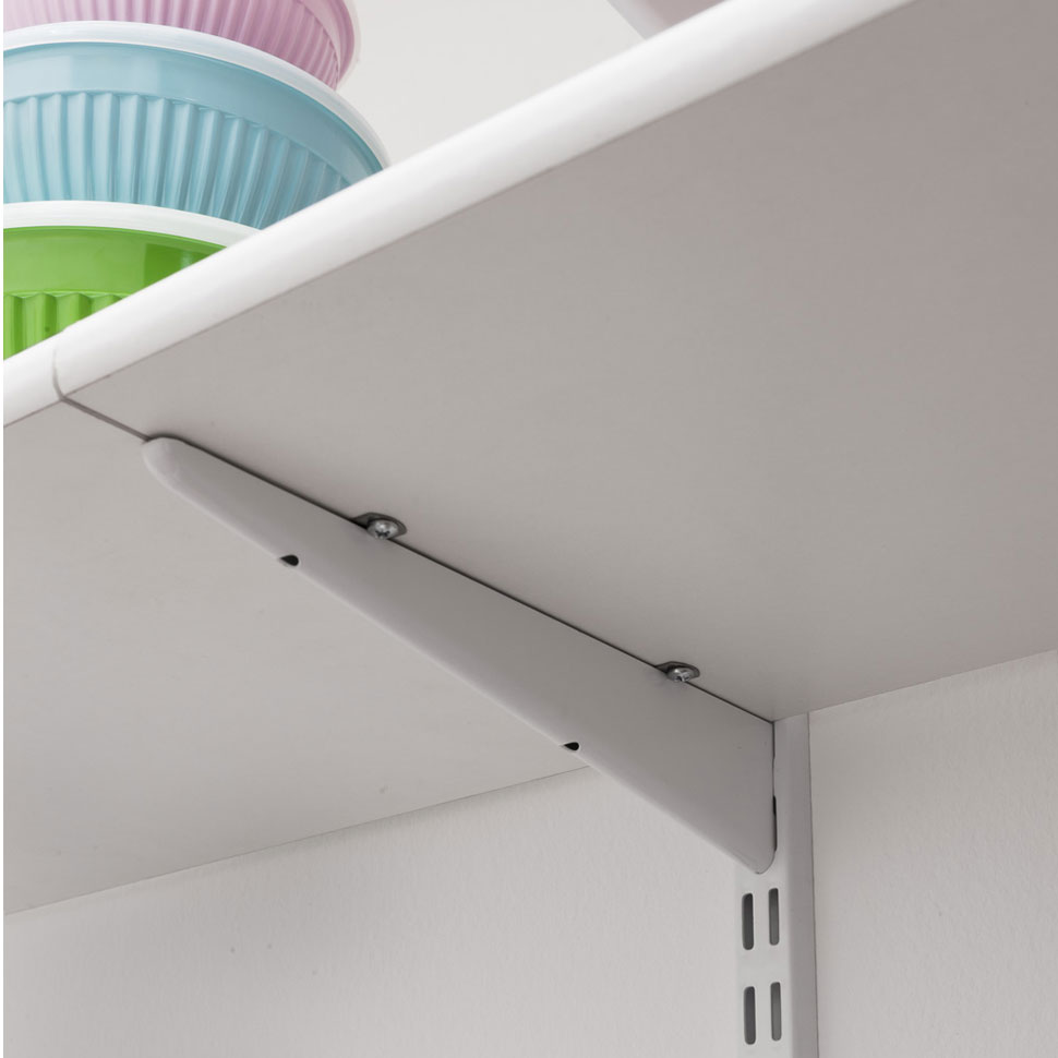 U-образный кронштейн вставляется в опорную планку без использования инструментов. К нему можно прикрутить непосредственно полку из мебельного щита (кронштейн имеет два отверстия для шурупов) или соединить две полки на одном кронштейне с помощью дополнительных двухсторонних креплений. В случае с концевыми кронштейнами стоит использовать односторонние крепления.