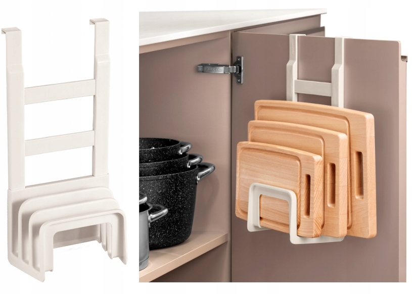 Идеально подходит для хранения разделочных досок и экономии места. Ручку следует вешать на внутреннюю или внешнюю сторону дверцы кухонных шкафов, положение ручки в подвесной части можно регулировать в соответствии с вашими потребностями.