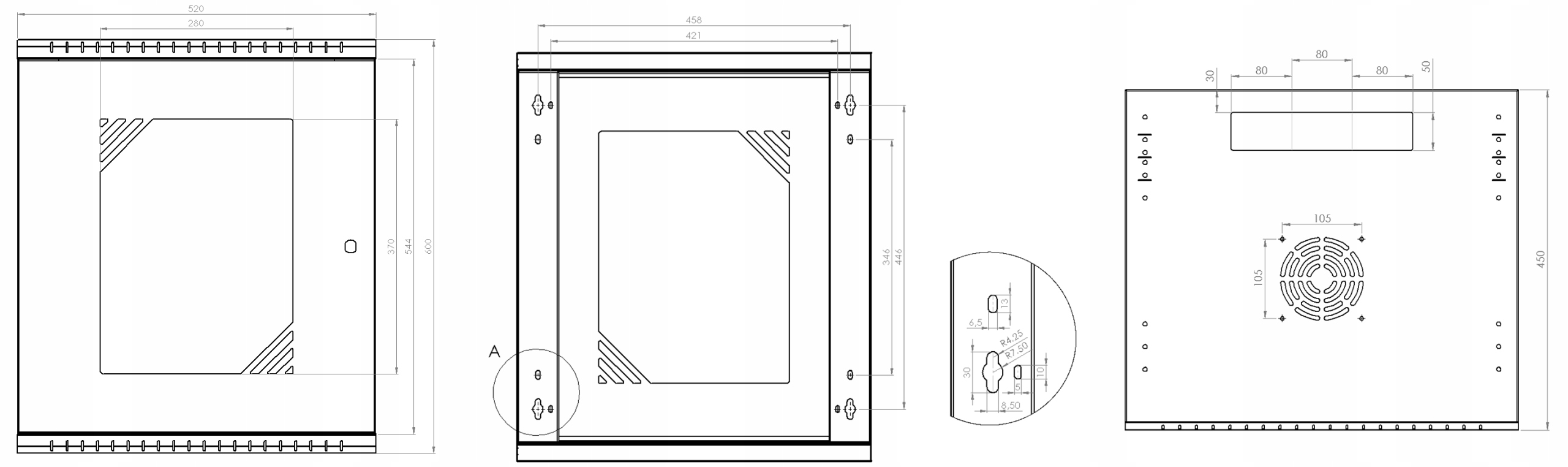 В нижней и верхней части шкафа предусмотрено место для вентилятора размерами: 120 мм х 120 мм (расстояние между винтами: 105 мм х 105 мм).